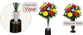 Up until their development of the Stay-In-The-Vase® design products, there was not a product that would effectively keep the silk flowers in the cemetery vase. Florist foam was the most common product used. It does not hold the flowers in the vase. By using the Stay-In-The-Vase® silk cemetery flowers by Flowers For Cemeteries you will be pleased to find the flowers will not blow away and will not float out of the vase.