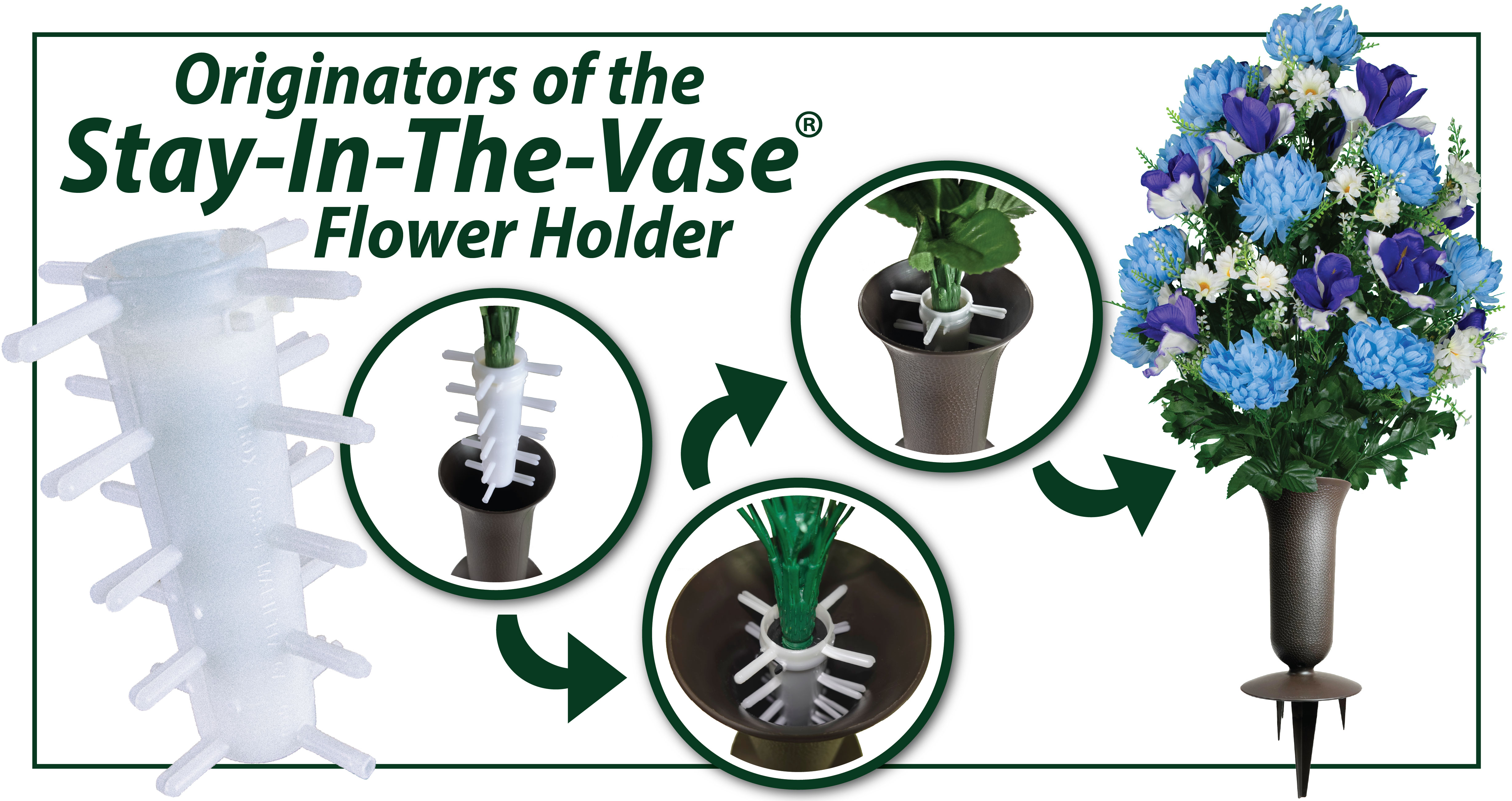 Up until their development of the Stay-In-The-Vase® design products, there was not a product that would effectively keep the silk flowers in the cemetery vase. Florist foam was the most common product used. It does not hold the flowers in the vase. By using the Stay-In-The-Vase® silk cemetery flowers by Flowers For Cemeteries you will be pleased to find the flowers will not blow away and will not float out of the vase.