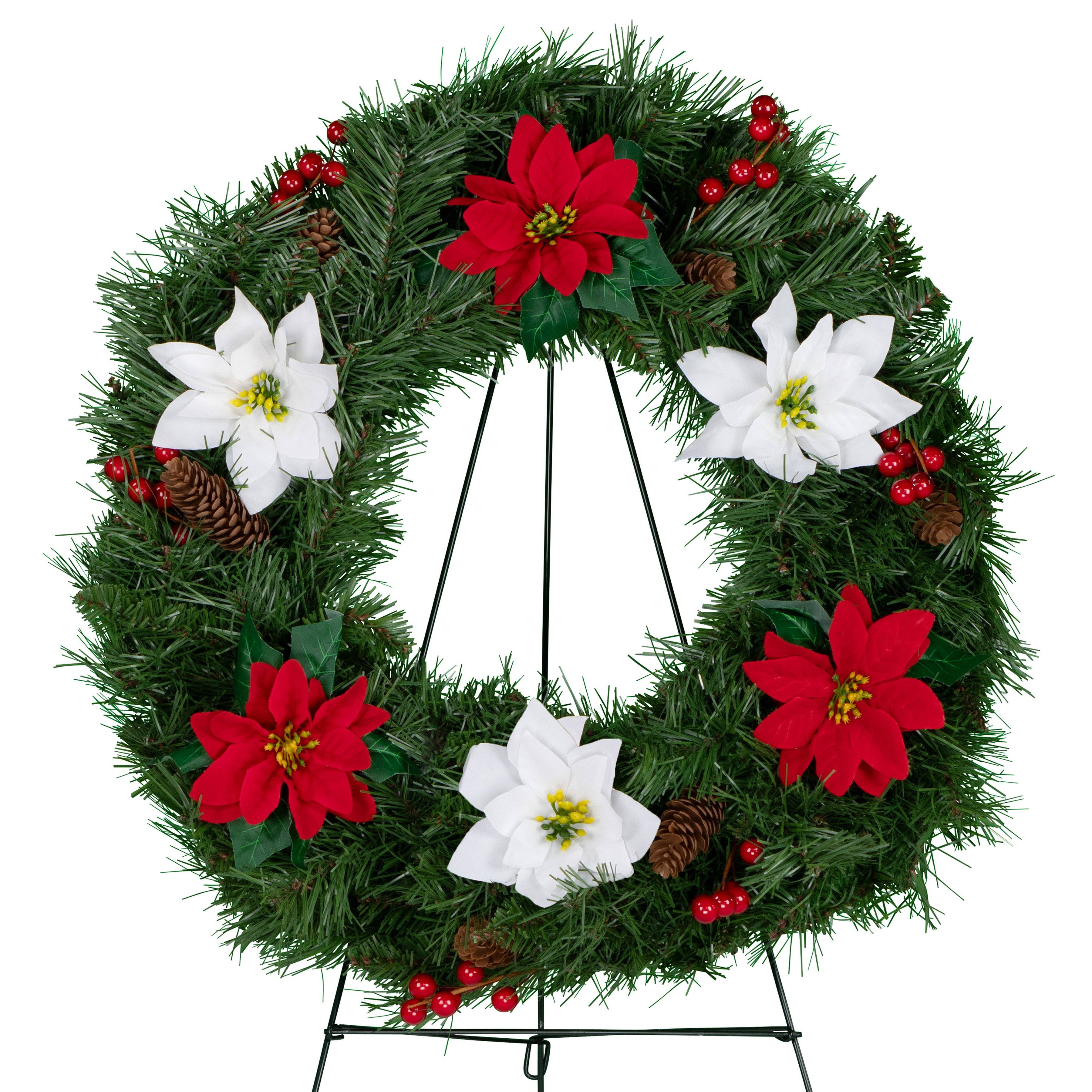 Sympathy Silks Tree on Easel with Poinsettias and Pinecones |