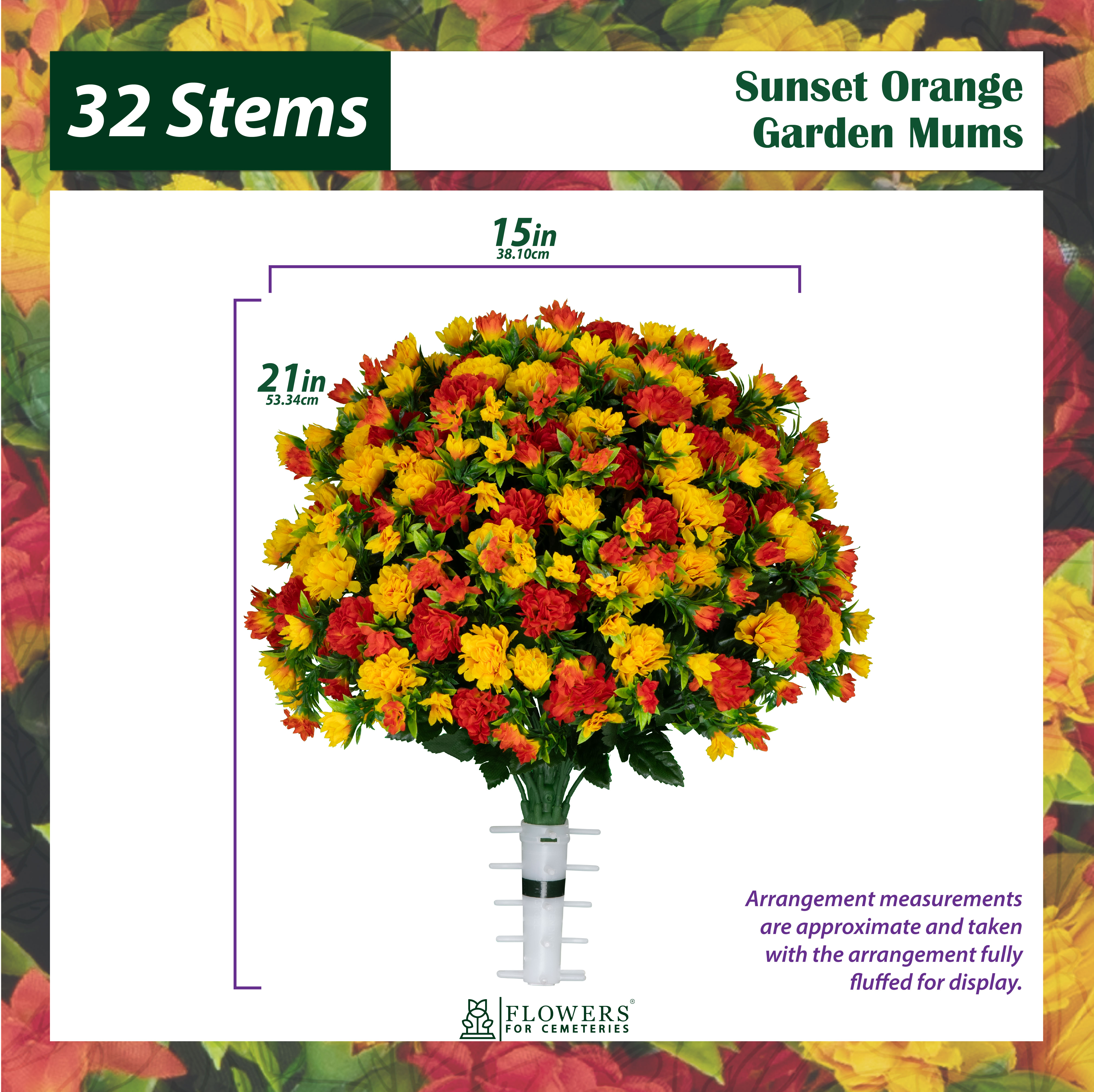 Remember your loved one with this beautiful artificial saddle and matching flower arrangement made with orange and yellow garden mums. This arrangement is about 20 inches tall from the very bottom to the top. The vase is not included, only the Stay-in-the-Vase Design is attached to the base of the flower arrangement.