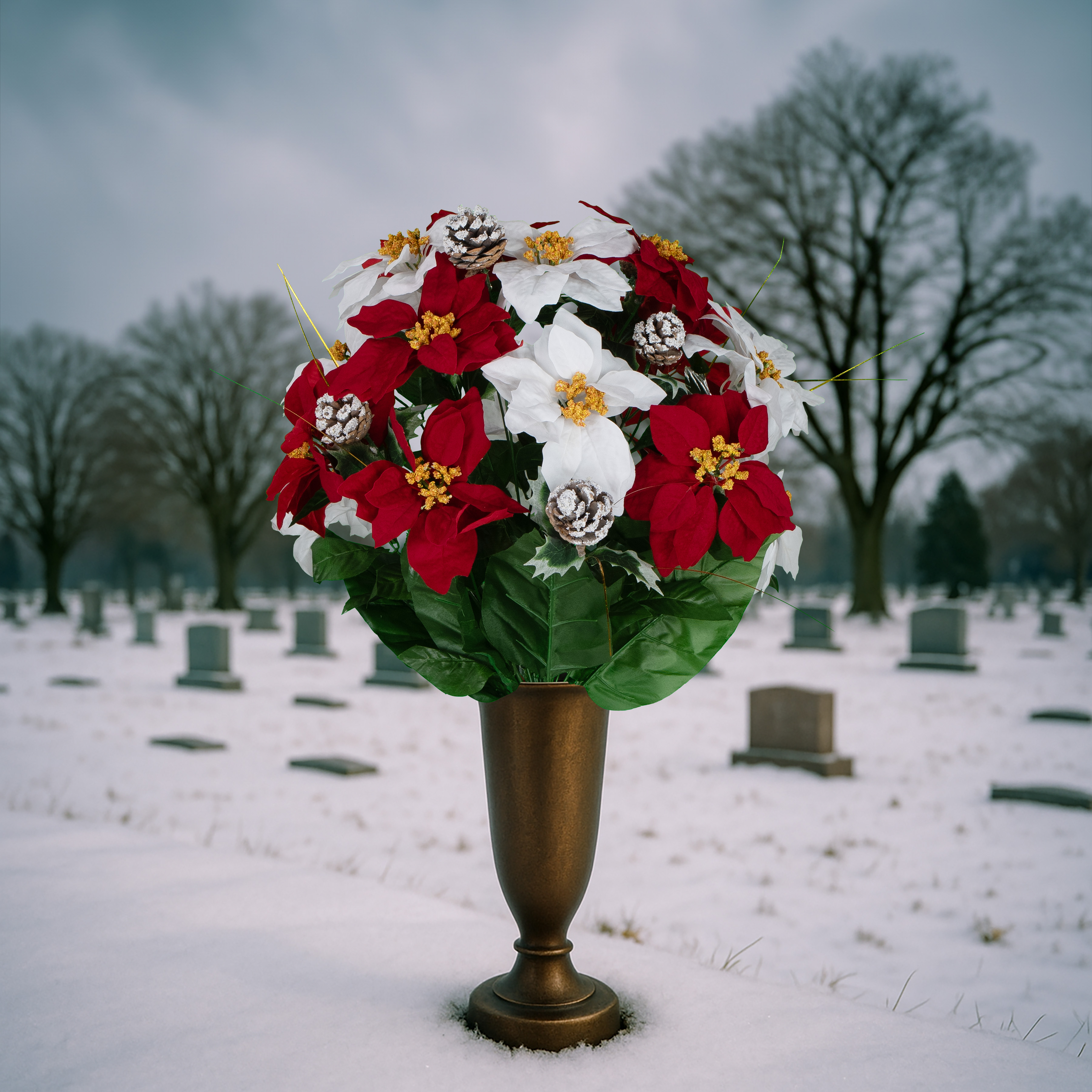 Remember your loved one with this beautiful silk flower arrangement made with red and white poinsettias with frosted pinecones. This arrangement is about 24 inches tall from the very bottom to the top. The vase is not included, only the Stay-in-the-Vase Design is attached to the base of the flower arrangement.