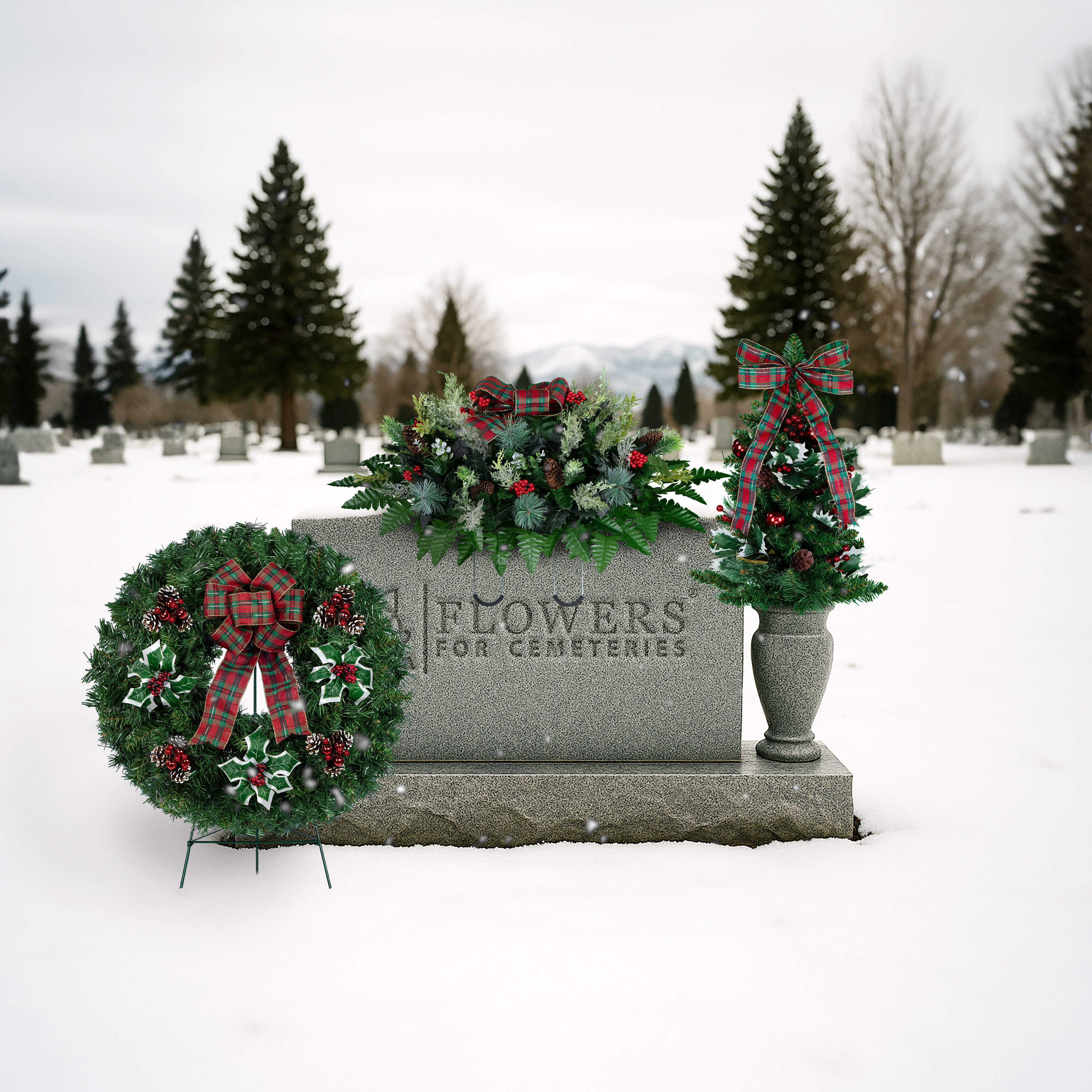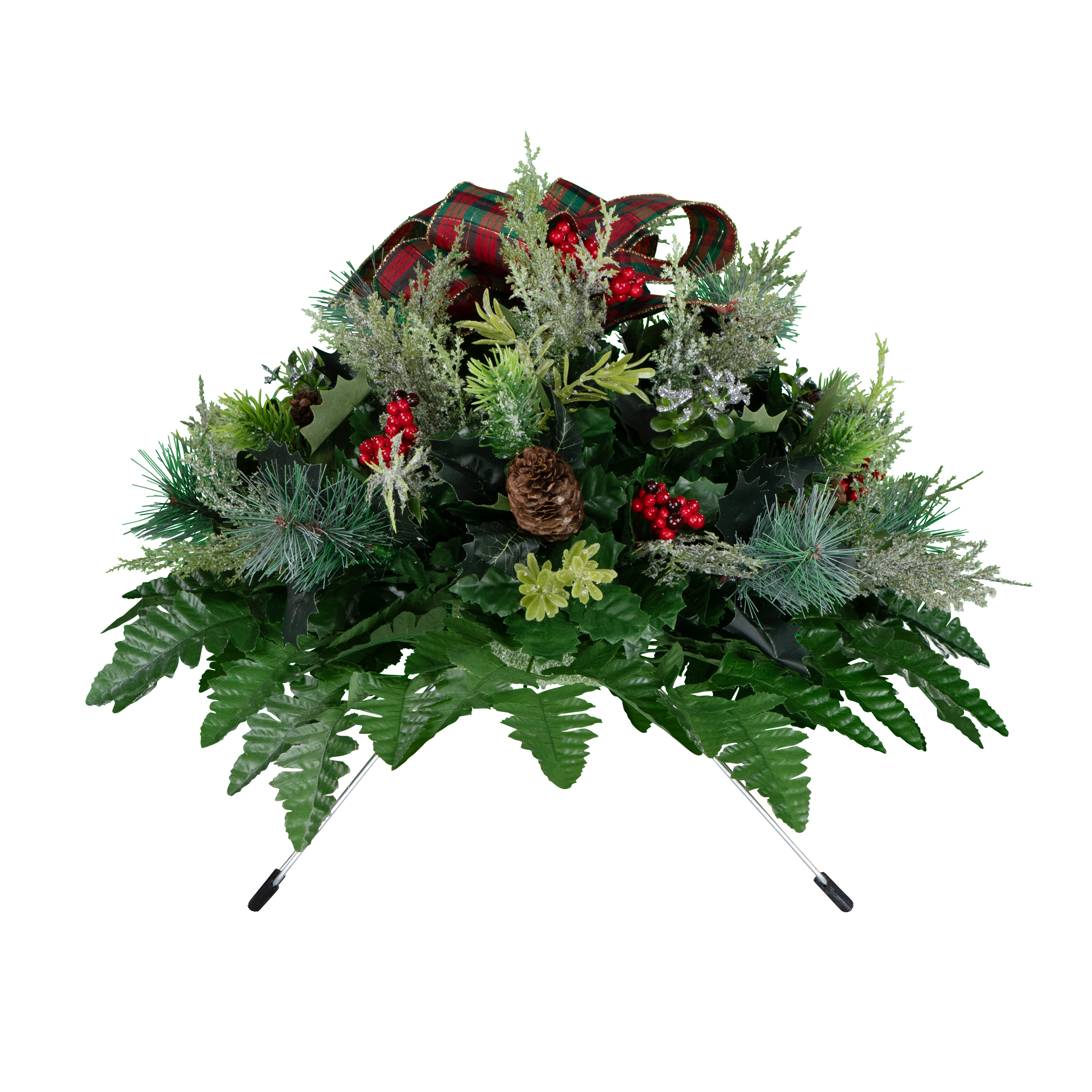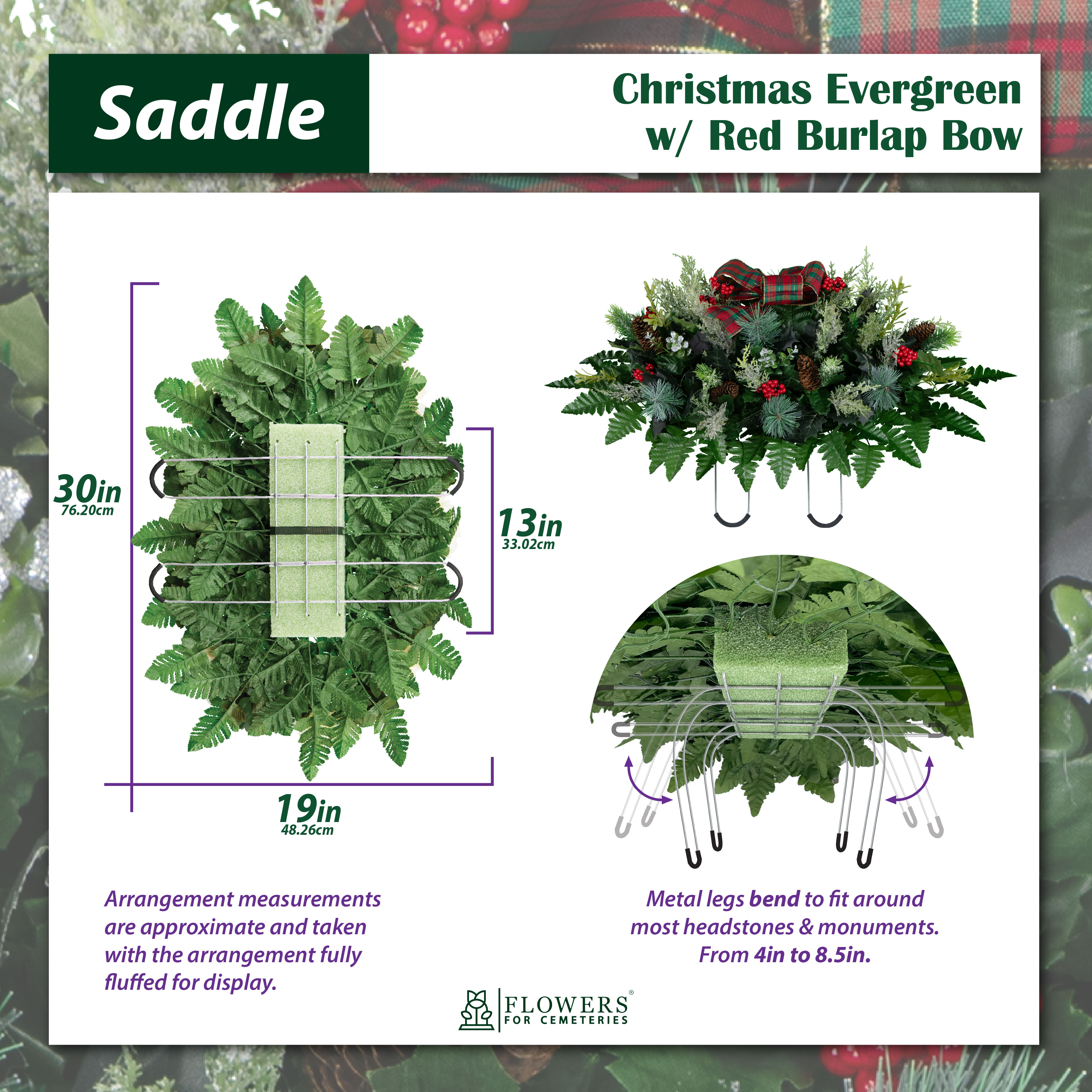 A classic saddle arrangement made using beautiful Christmas evergreen with plaid bow. Fern surrounds the bottom part of the arrangement.