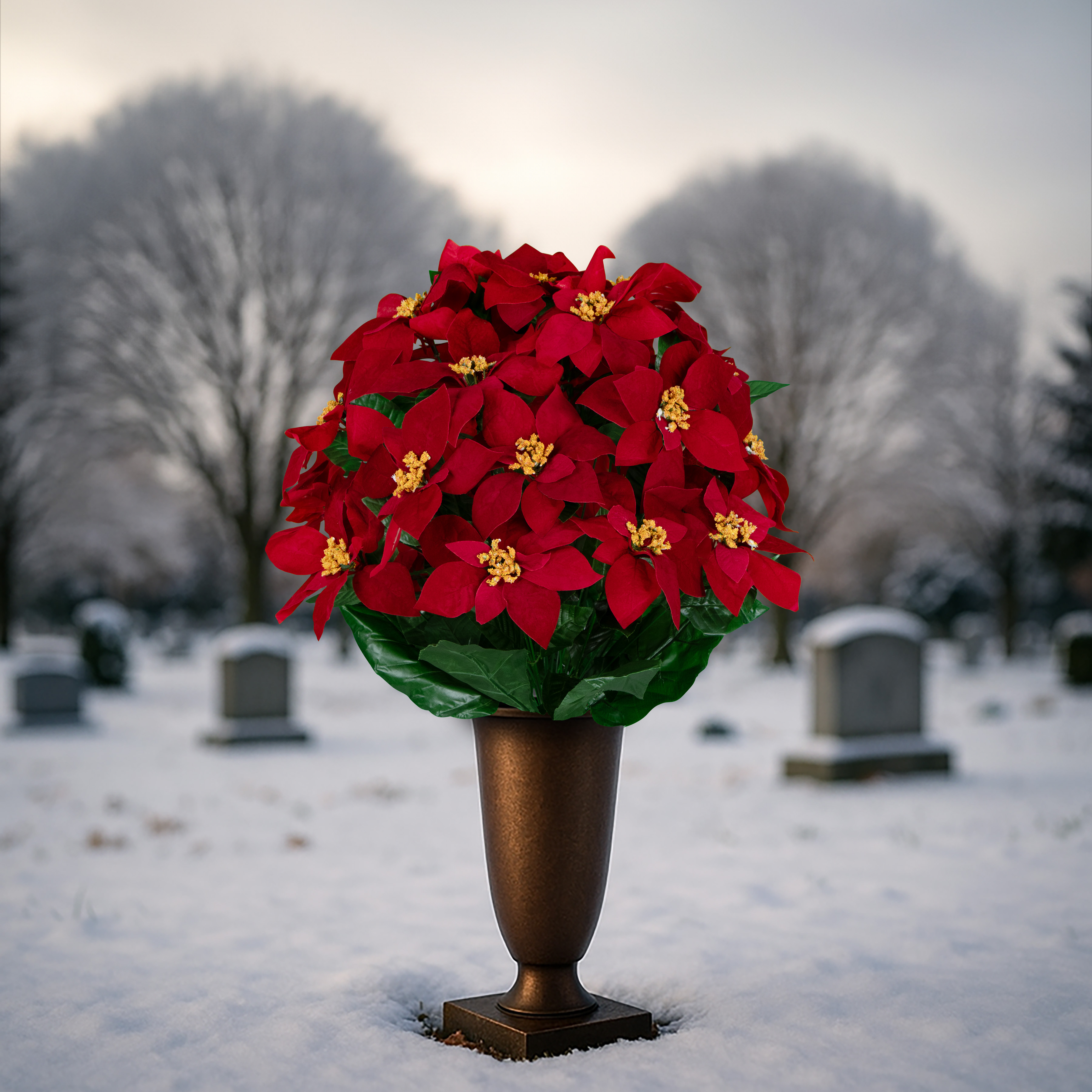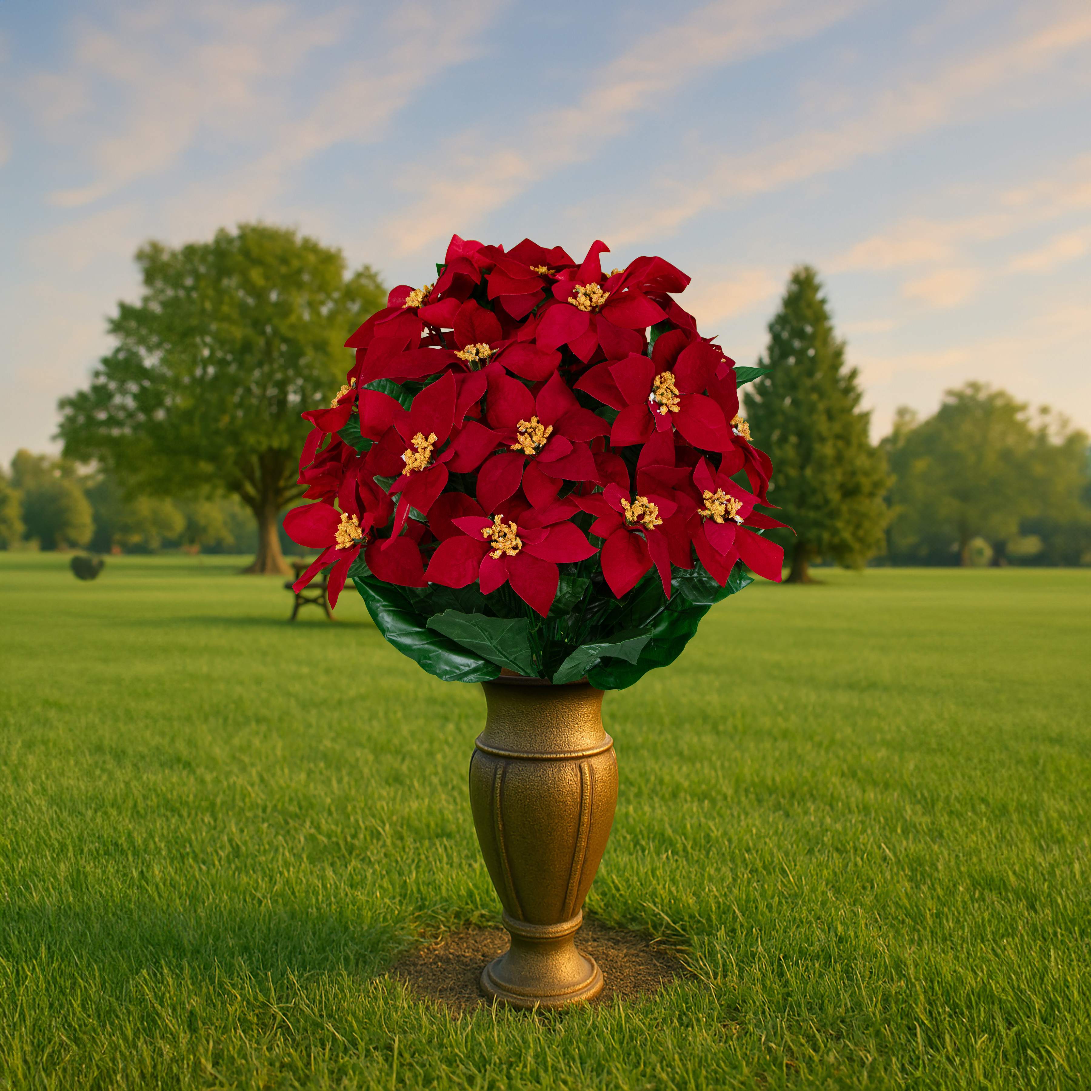 Remember your loved one with this beautiful silk flower arrangement made with red poinsettias. This arrangement is about 24 inches tall from the very bottom to the top. The vase is not included, only the Stay-in-the-Vase Design is attached to the base of the flower arrangement.