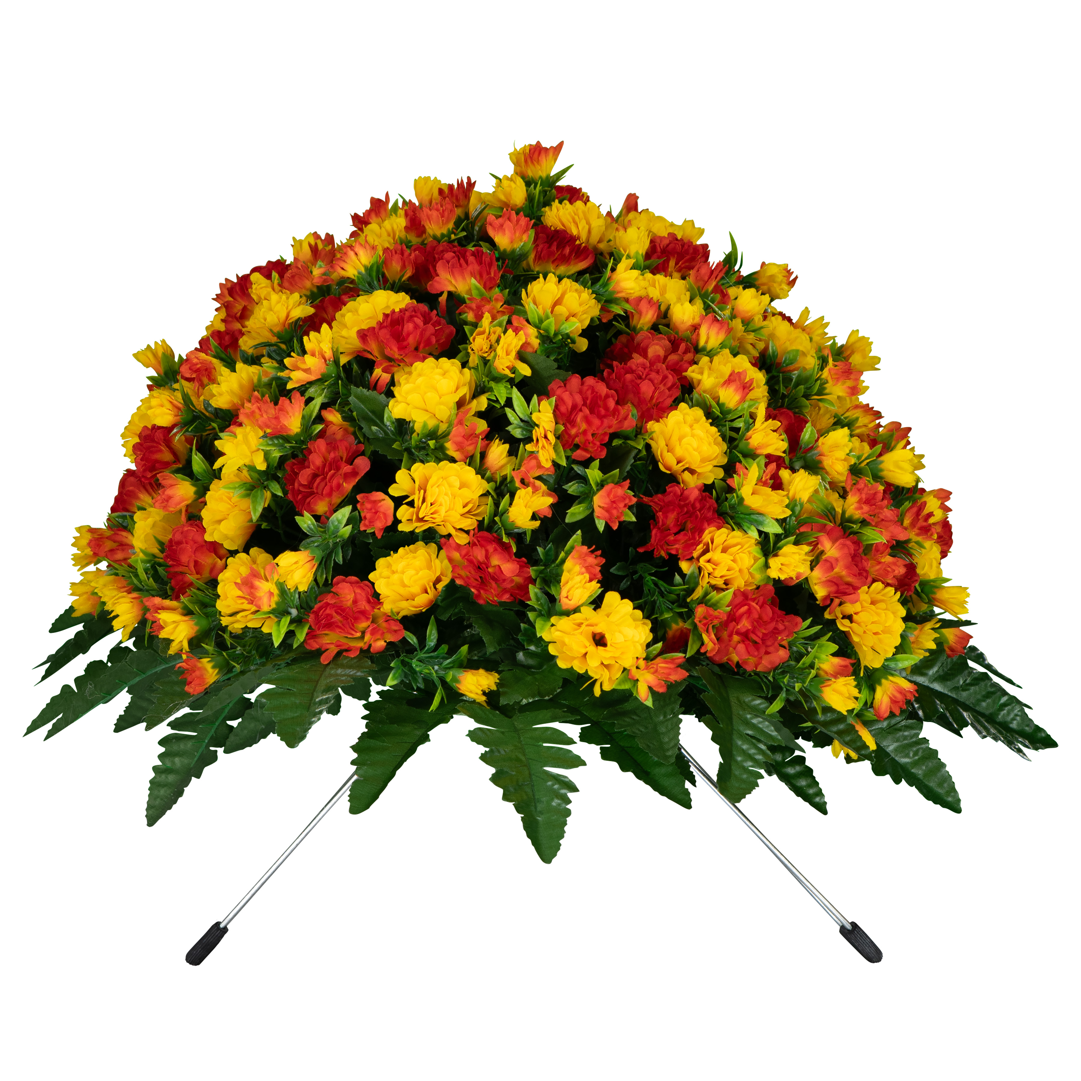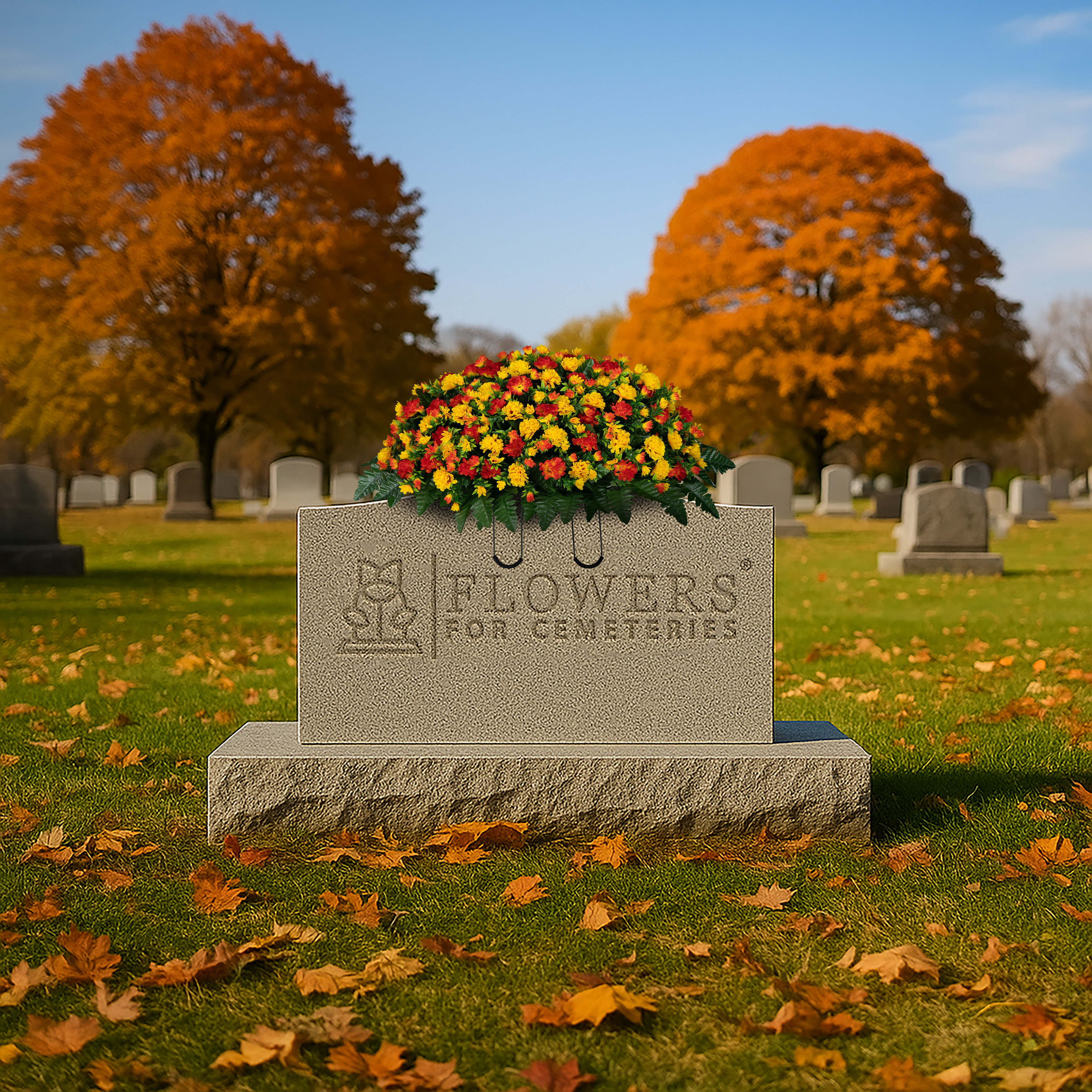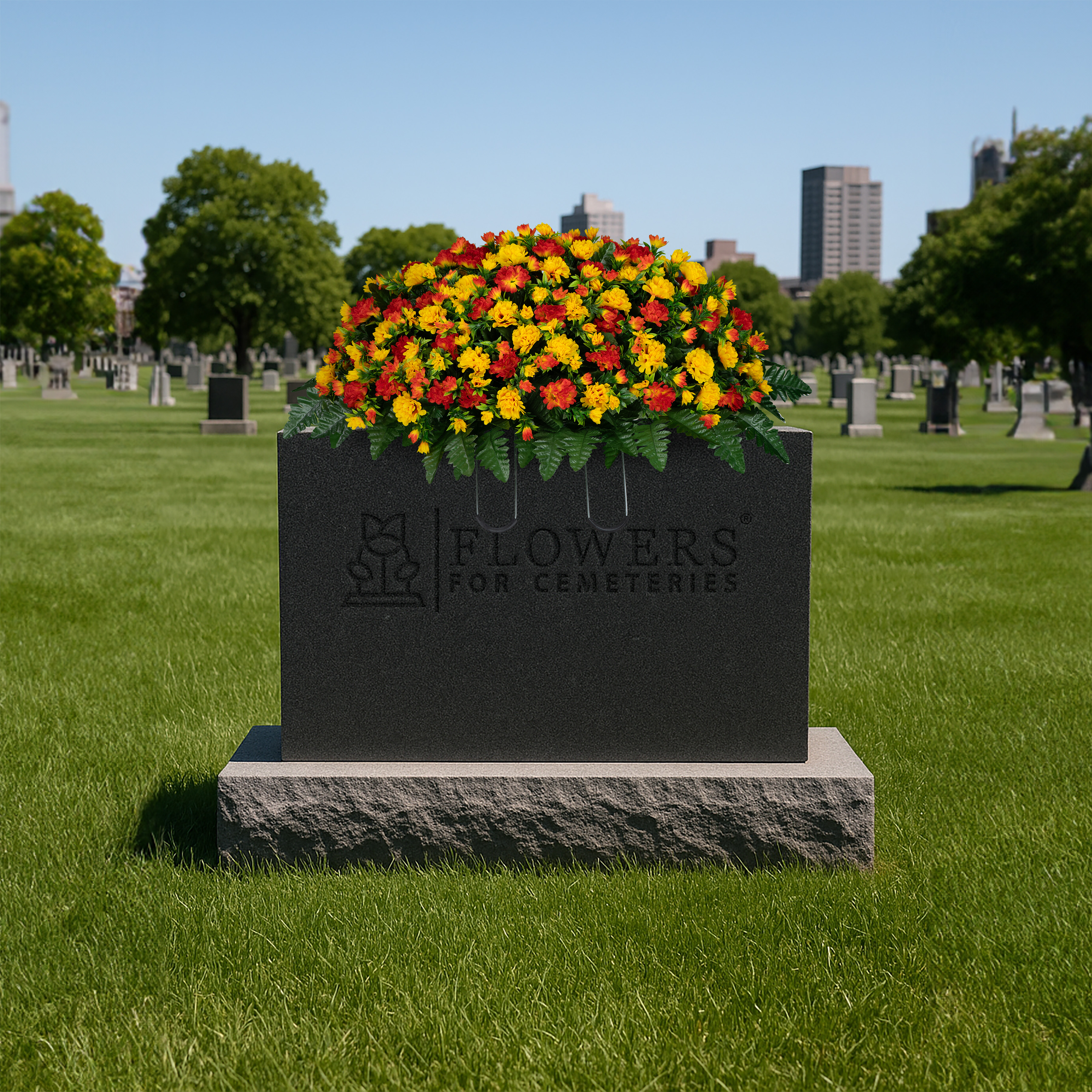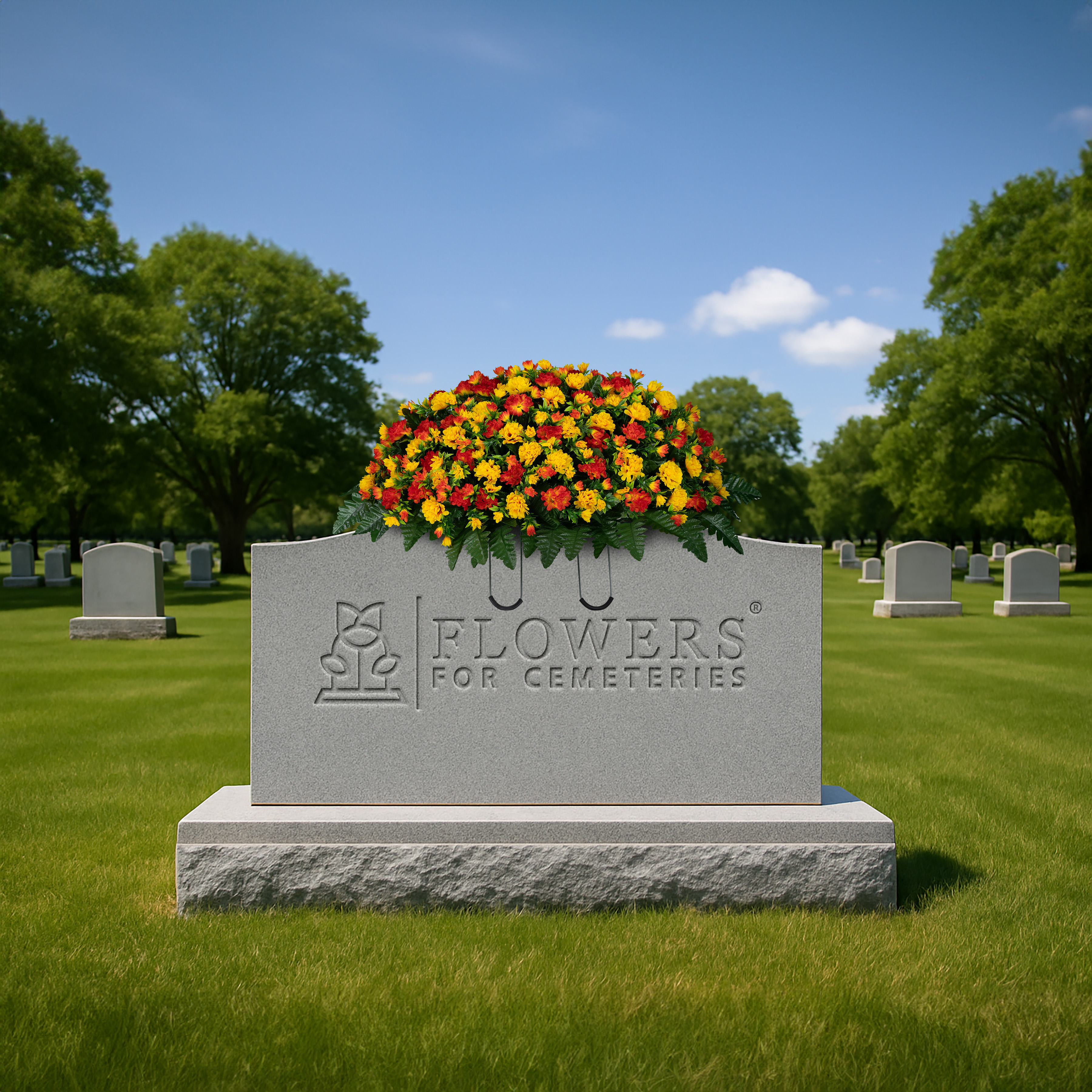 This handmade saddle arrangement is designed using Flowers For Cemeteries, Inc's high quality silk bouquets. The dyes used in the manufacturing process are ultraviolet (UV) resistant and the silk material has been treated to prevent color bleeding when it gets wet. This bouquet is designed to be in a cemetery, exposed to the elements, and still look great after 2 months.