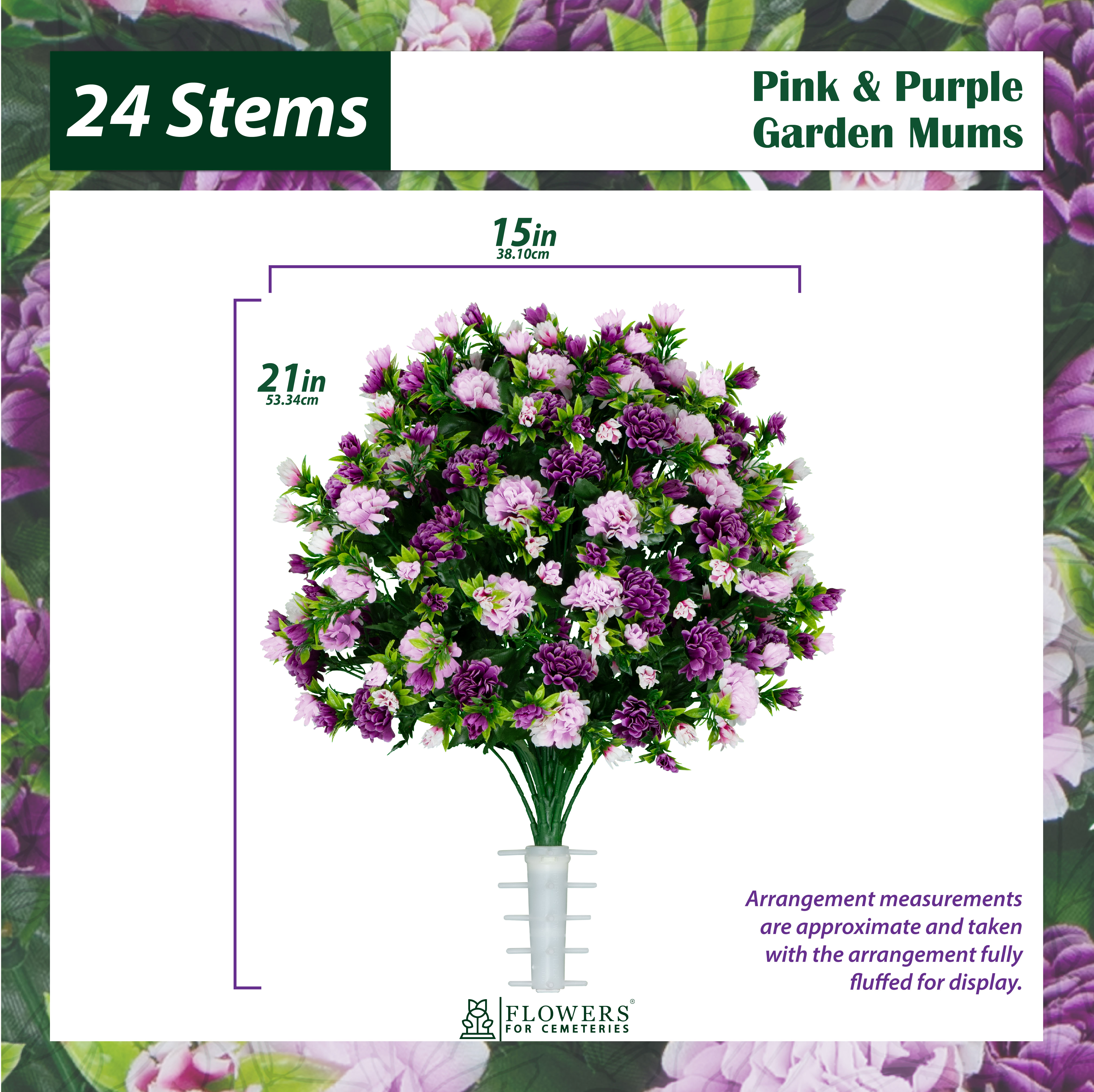 Remember your loved one with this beautiful silk flower arrangement made with pink and purple garden mums. This arrangement is about 18 inches tall from the very bottom to the top. The vase is not included, only the Stay-in-the-Vase Design is attached to the base of the flower arrangement.