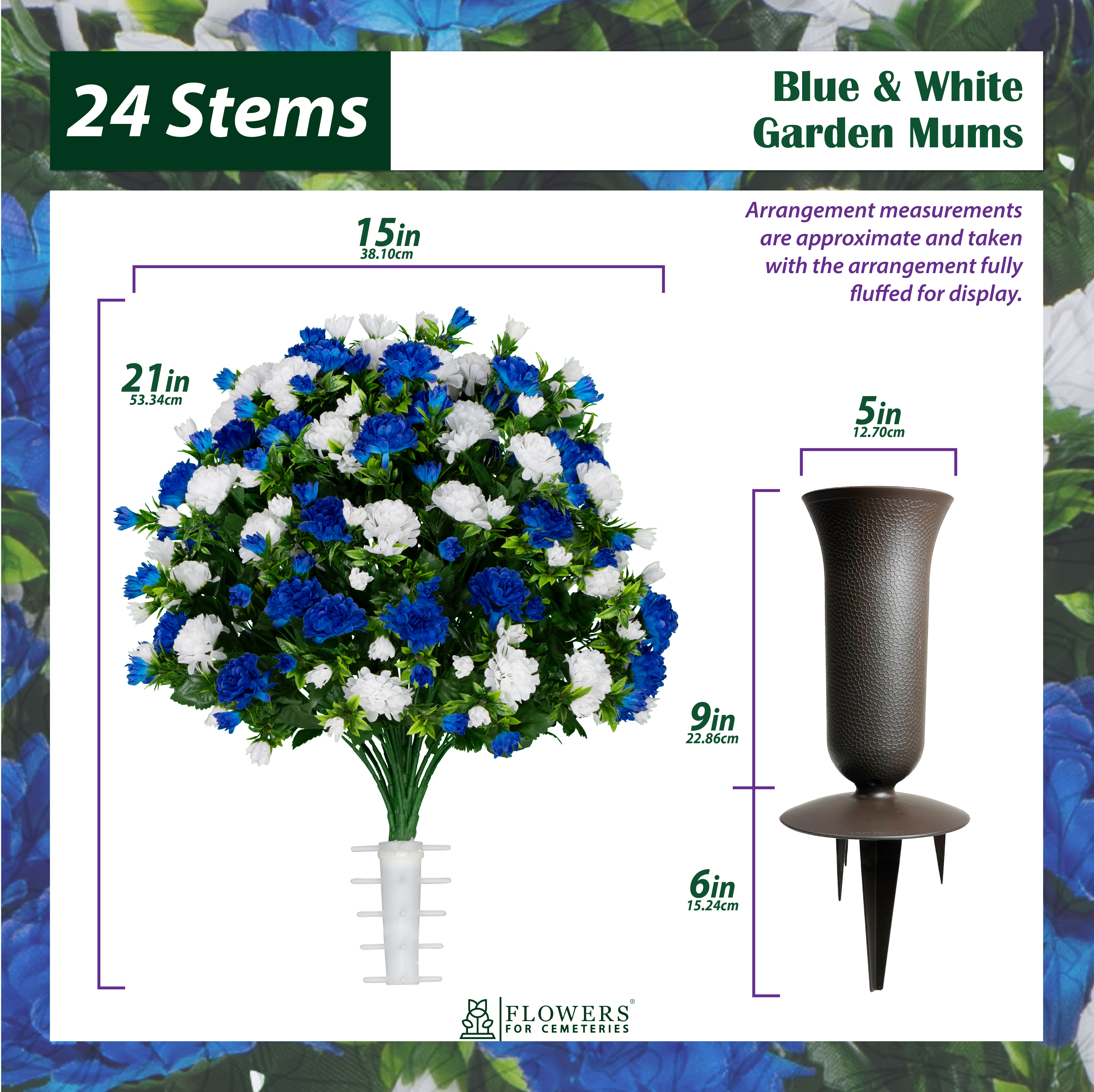 Blue and White Mums Saddle and 1 Bouquet with Sympathy Silks Vase