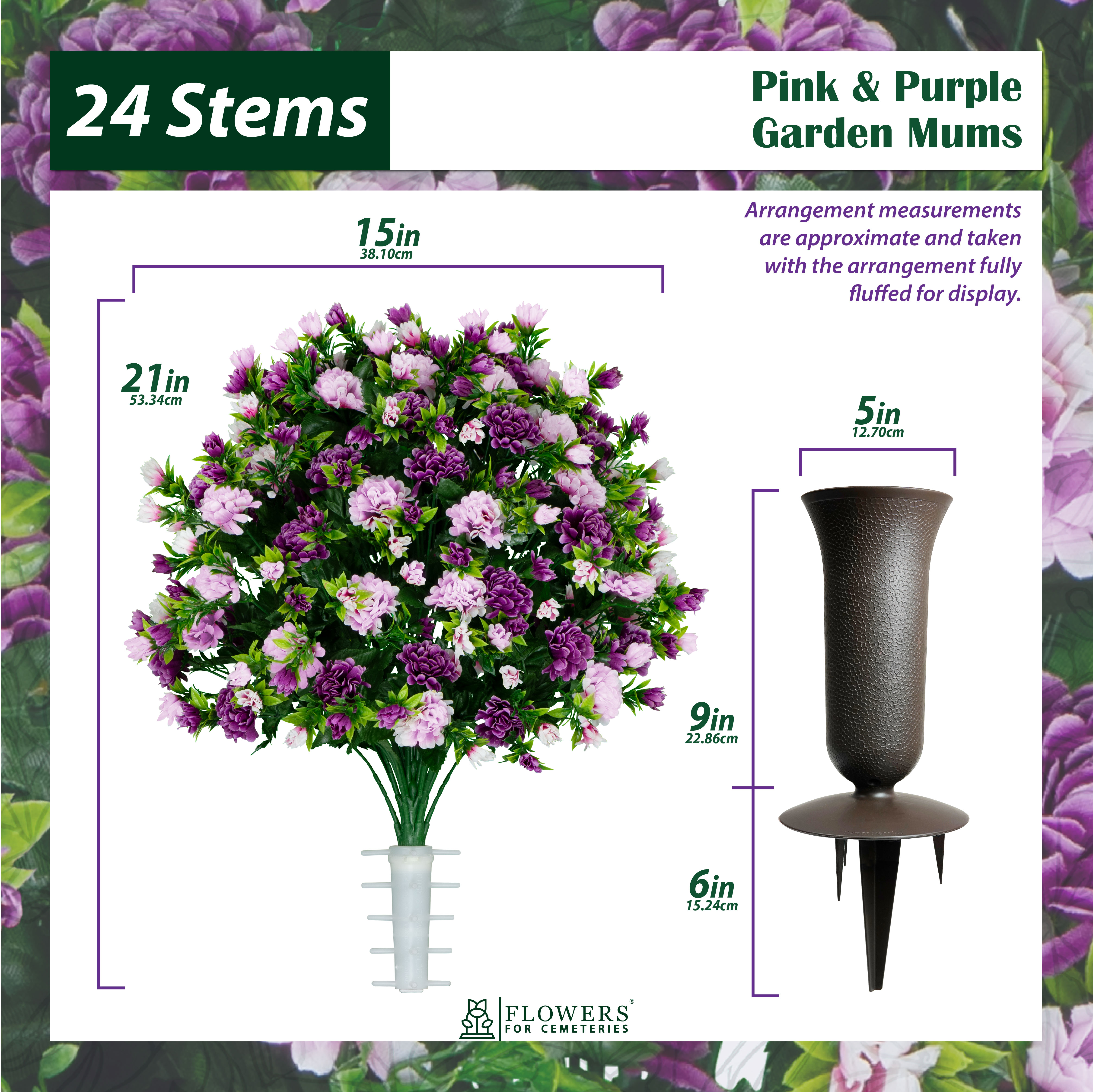 The vase arrangements come with our Sympathy Silks Vase. The Sympathy Silks Vase is ingeniously designed with 4 spikes at the bottom to provide exceptional stability. This ensures that the vase remains securely in place after sticking it into the ground, allowing you to pay your respects and honor your loved ones without worrying about accidental tipping or movement. This patented, Flowers For Cemeteries exclusive vase is designed to hold all of our ground vase arrangements securely so they will not blow away or float out. It is crafted from high-quality, durable plastic material and is built to withstand the elements and the passage of time.