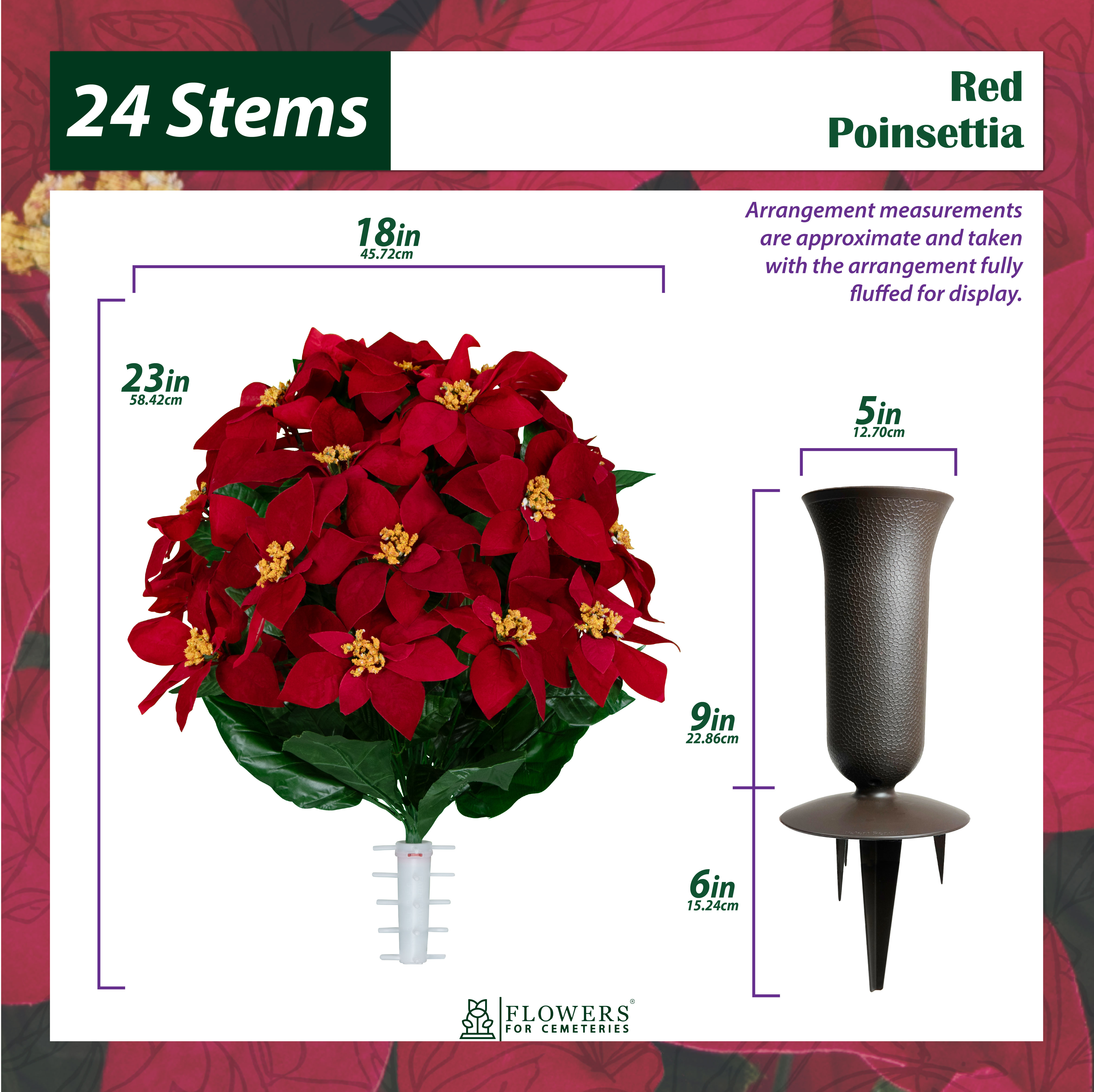 Remember your loved one with this beautiful silk flower arrangement made with red poinsettias. This arrangement is about 24 inches tall from the very bottom to the top.