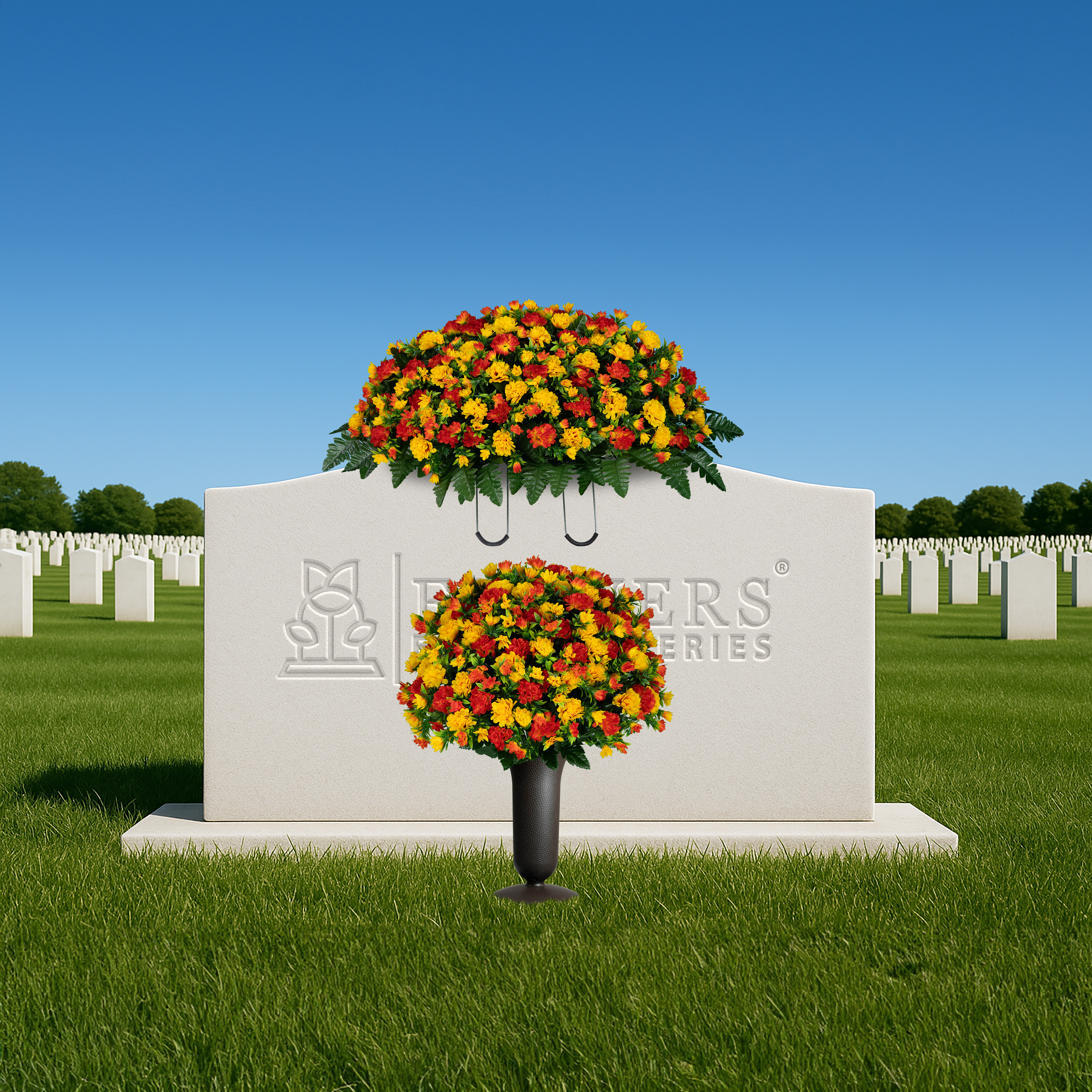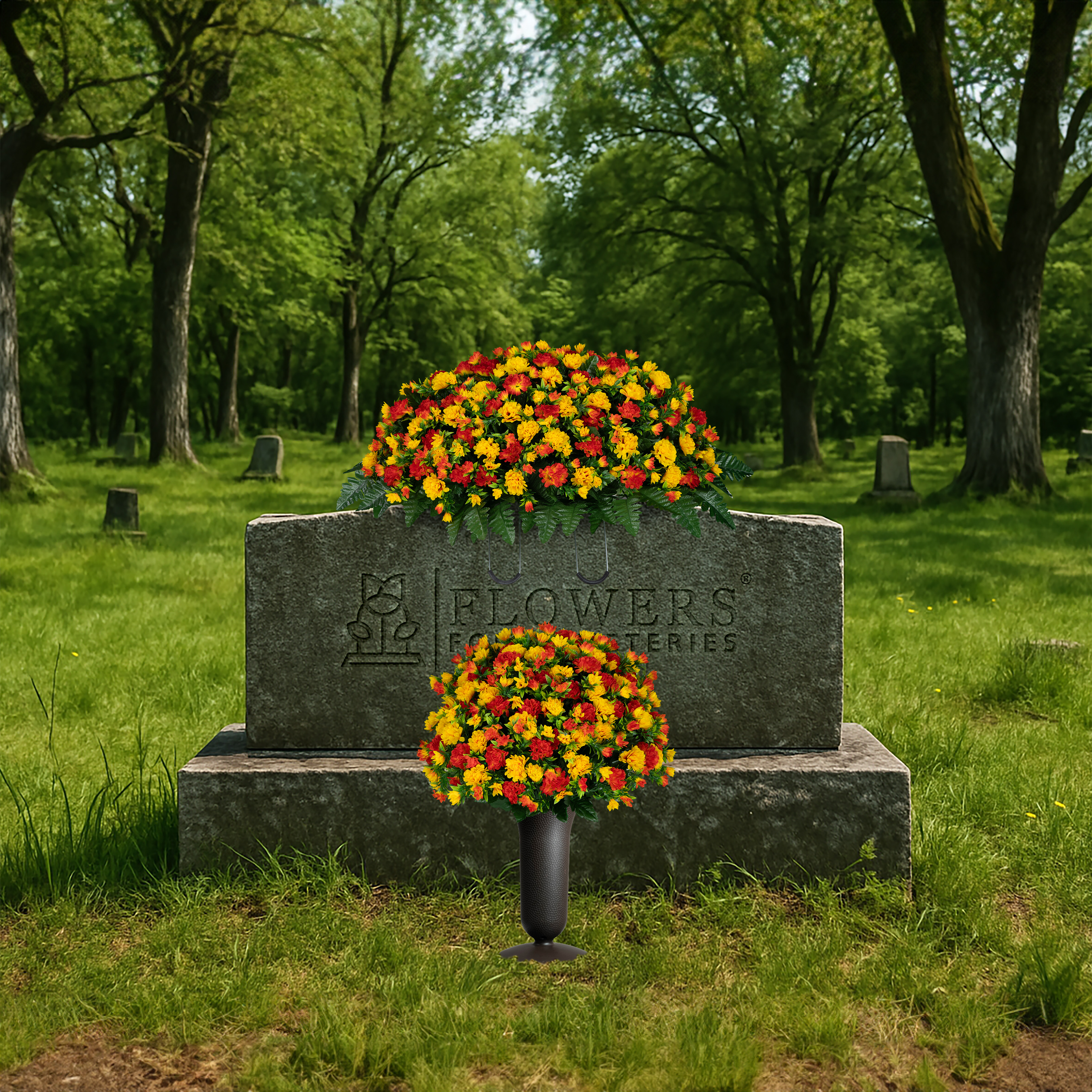 The vase arrangement comes with our Sympathy Silks Vase. The Sympathy Silks Vase is ingeniously designed with 4 spikes at the bottom to provide exceptional stability. This ensures that the vase remains securely in place after sticking it into the ground, allowing you to pay your respects and honor your loved ones without worrying about accidental tipping or movement. This patented, Flowers For Cemeteries exclusive vase is designed to hold all of our ground vase arrangements securely so they will not blow away or float out. It is crafted from high-quality, durable plastic material and is built to withstand the elements and the passage of time.