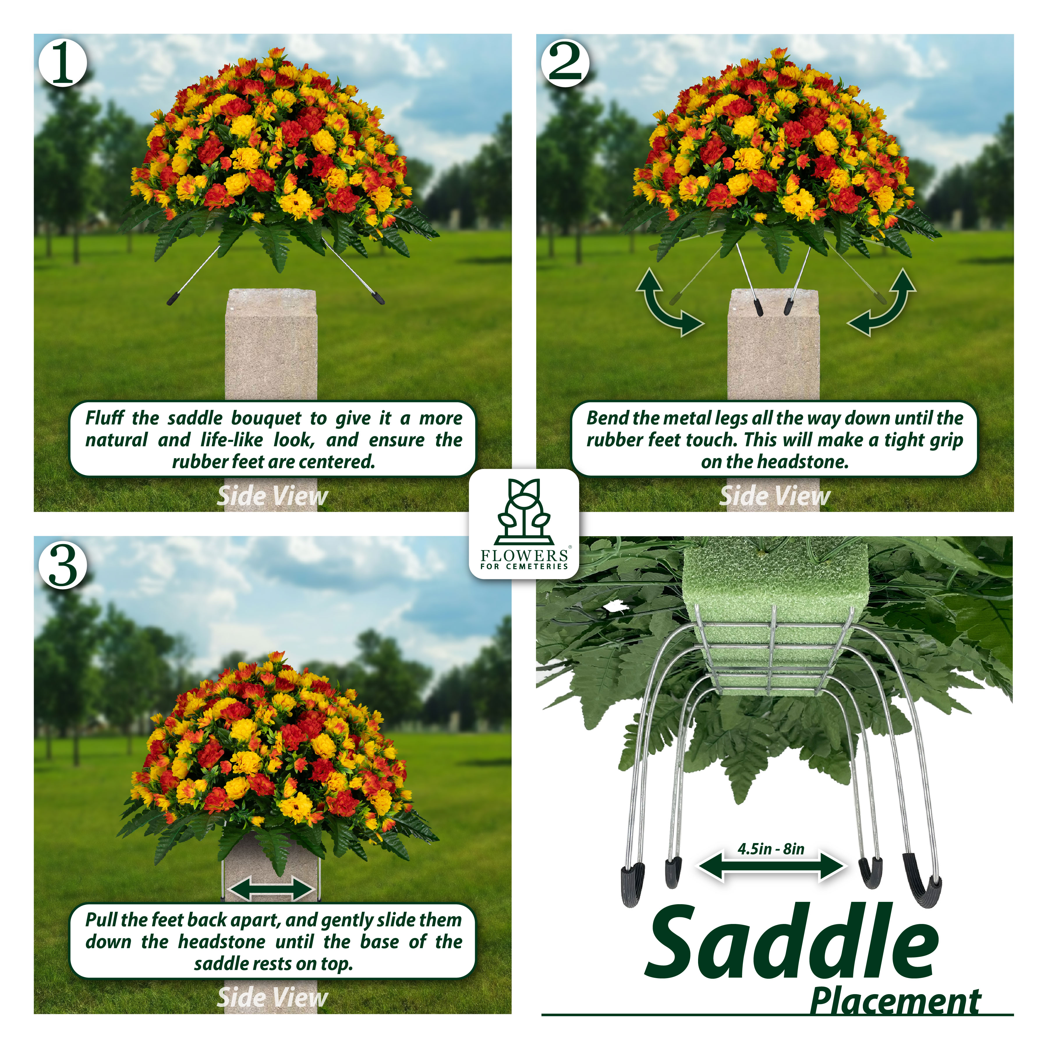 This handmade saddle arrangement and bouquet are designed using Flowers For Cemeteries, Inc's high quality silk bouquets. The dyes used in the manufacturing process are ultraviolet (UV) resistant and the silk material has been treated to prevent color bleeding when it gets wet. This bouquet is designed to be in a cemetery, exposed to the elements, and still look great after 2-3 months.