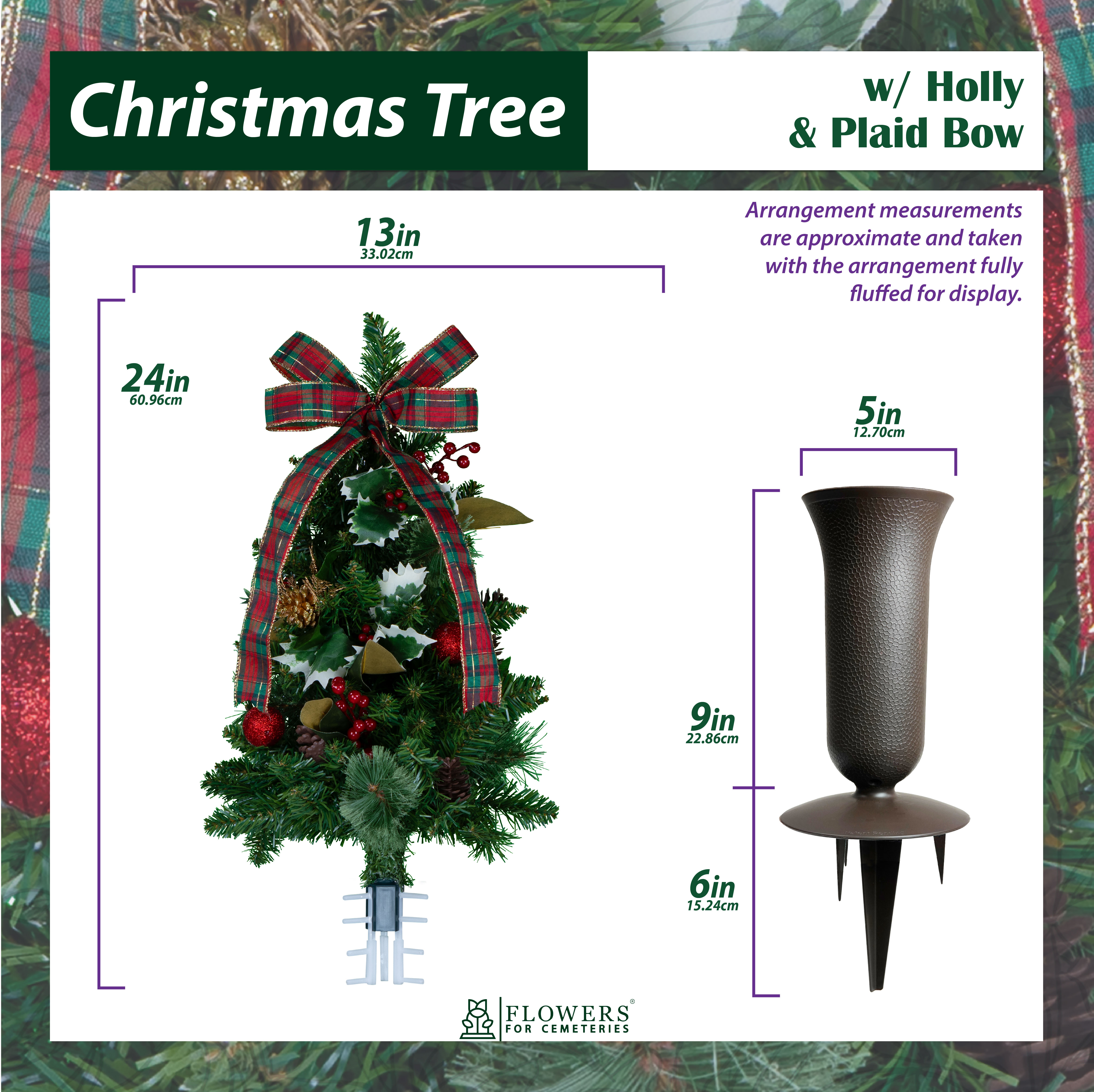 An artificial Christmas tree featuring Holly, Pinecones, Red Ornaments, and a Plaid Bow, this festive design brings warmth and cheer to any memorial or holiday display.