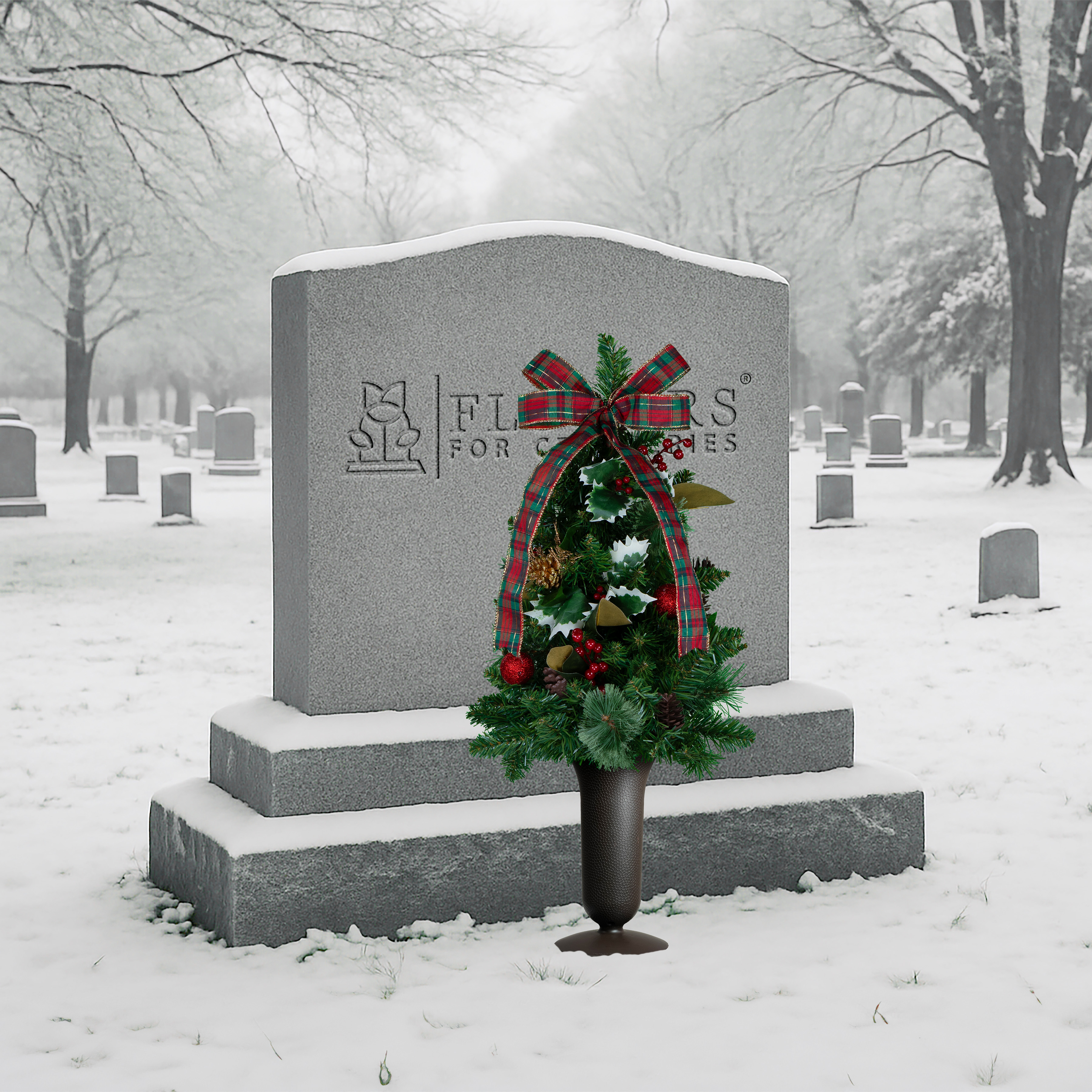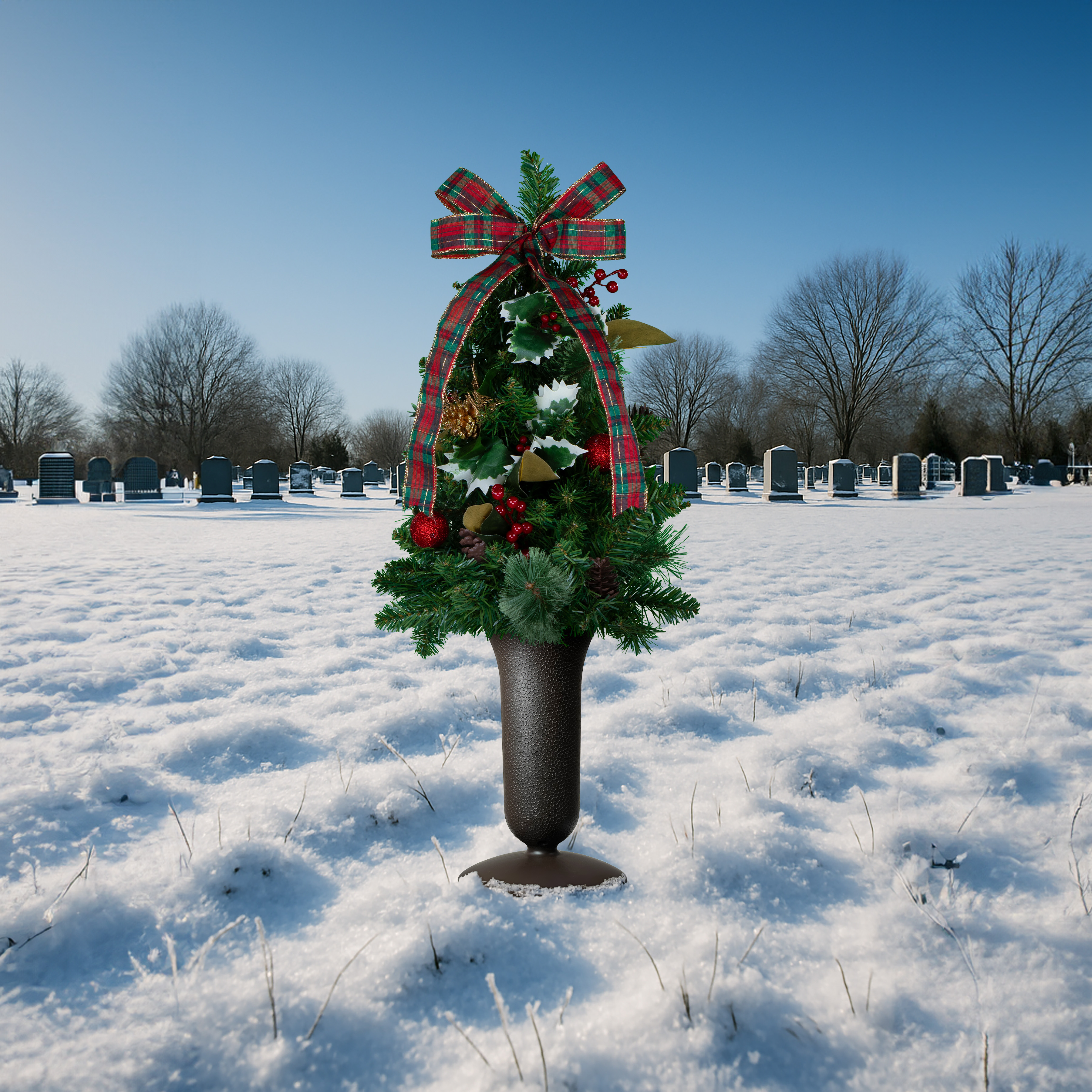We take pride in providing long-lasting, weather-resistant holiday arrangements for cemeteries. Every branch and ornament is made from UV-protected, non-bleed materials that resist fading, moisture, and temperature changes. Designed to remain vibrant for 2–3+ months outdoors, this artificial Christmas tree will keep your loved one’s memorial looking festive and beautiful throughout the season.
