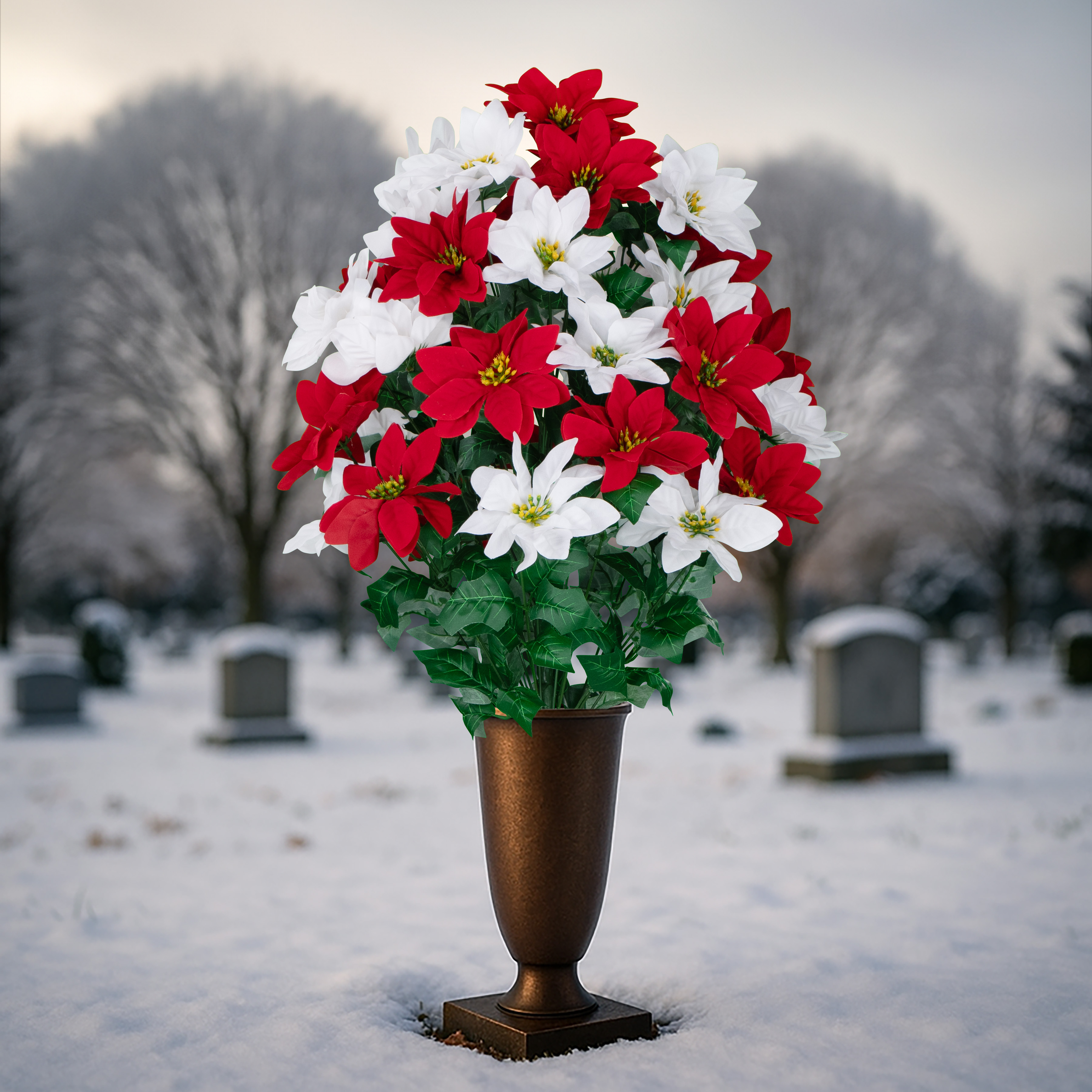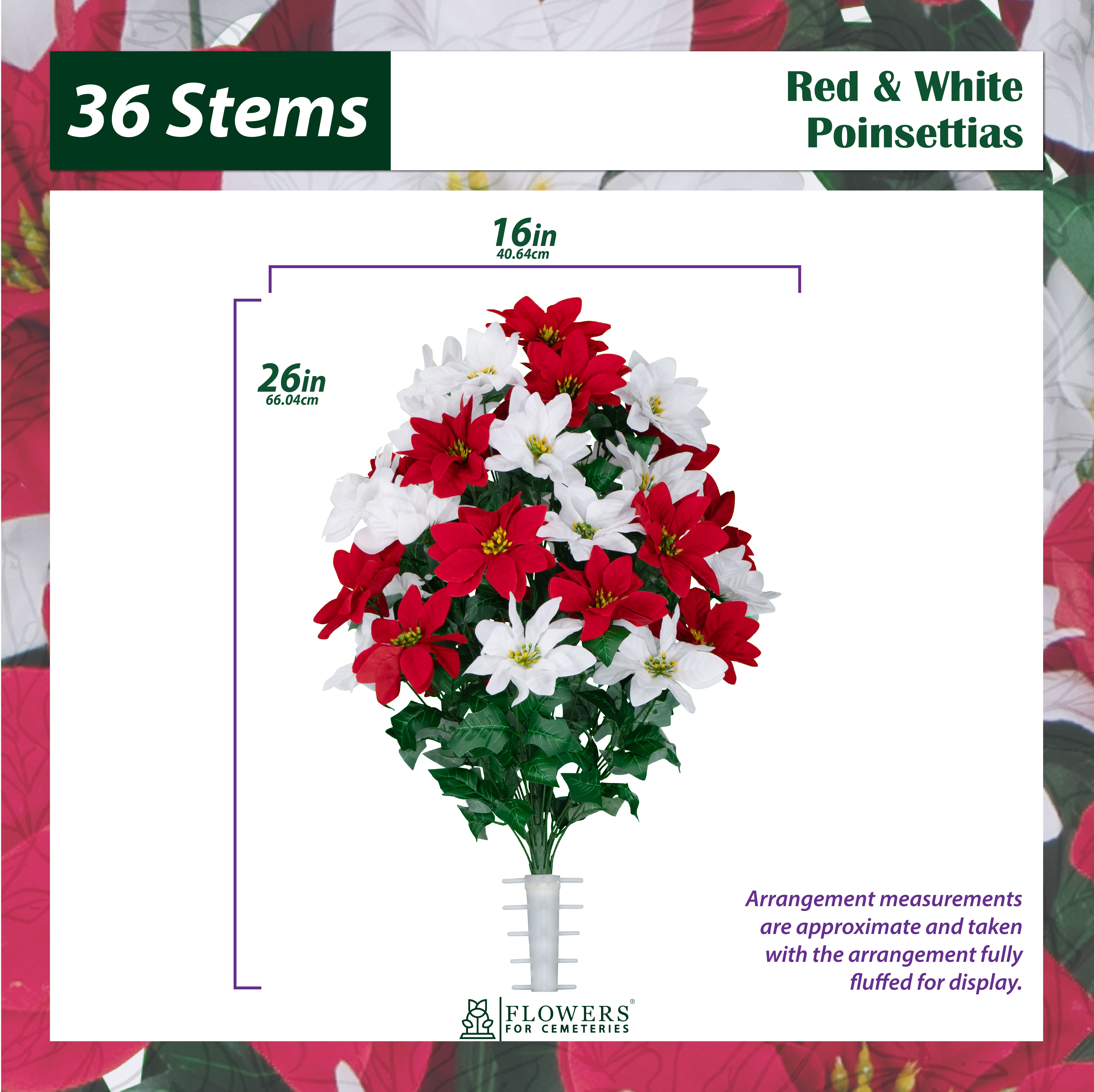 Remember your loved one with this beautiful silk flower arrangement made using Red and White Poinsettias. This arrangement is approximately 26 inches tall from top to bottom. A Sympathy Silks cemetery vase is not included, but is offered as a bundle of this arrangement. Only the Stay-in-the-Vase Device is attached to the base of the flower arrangement.