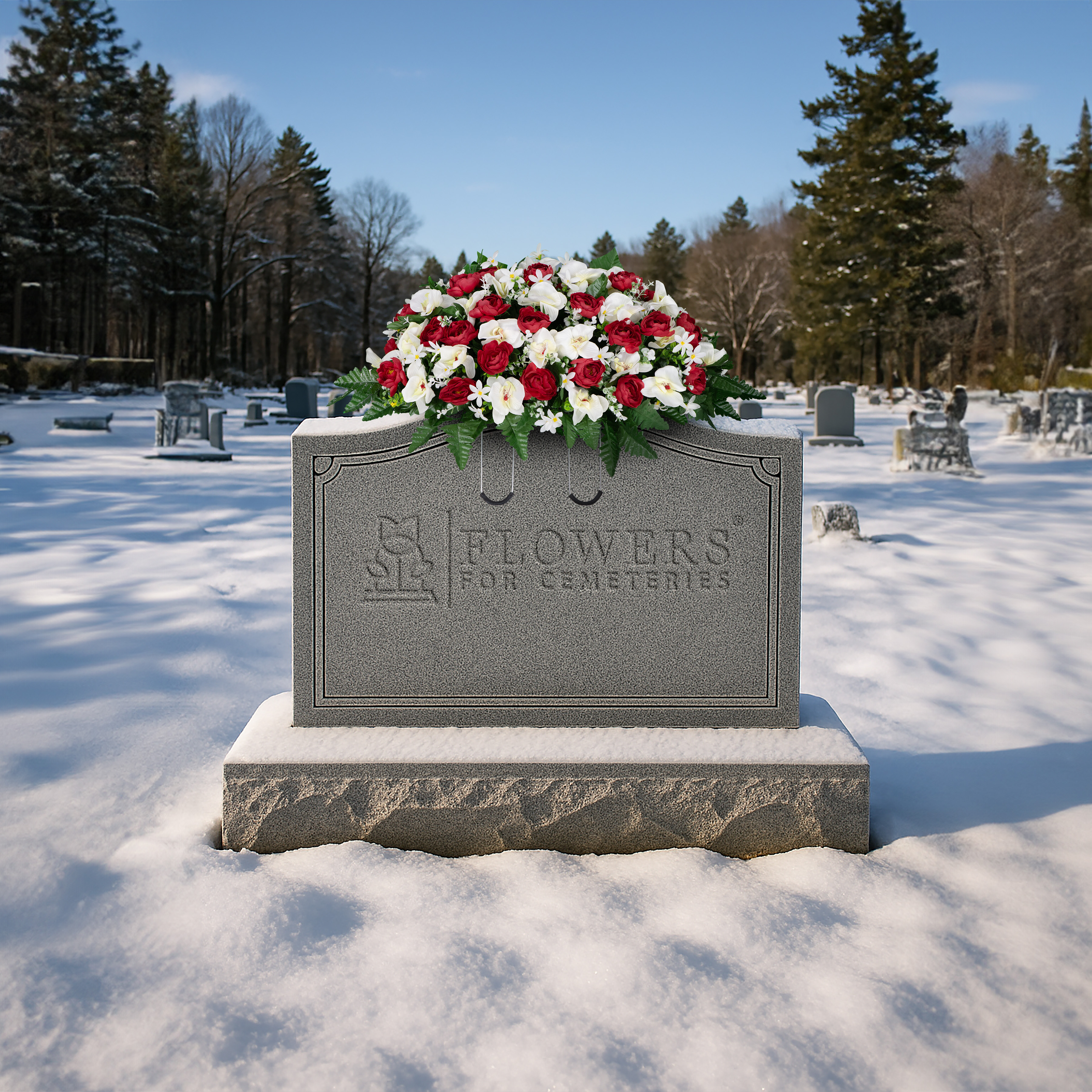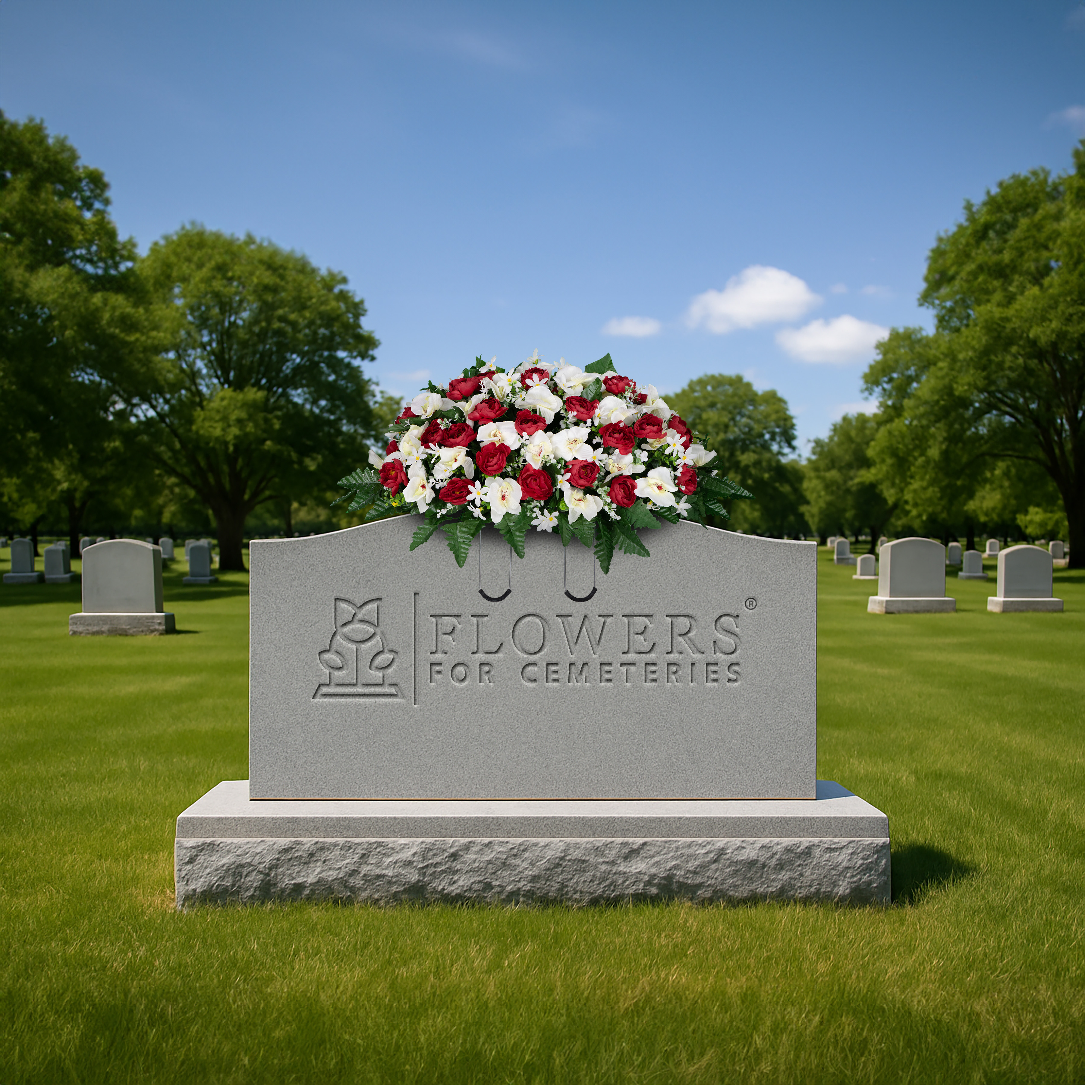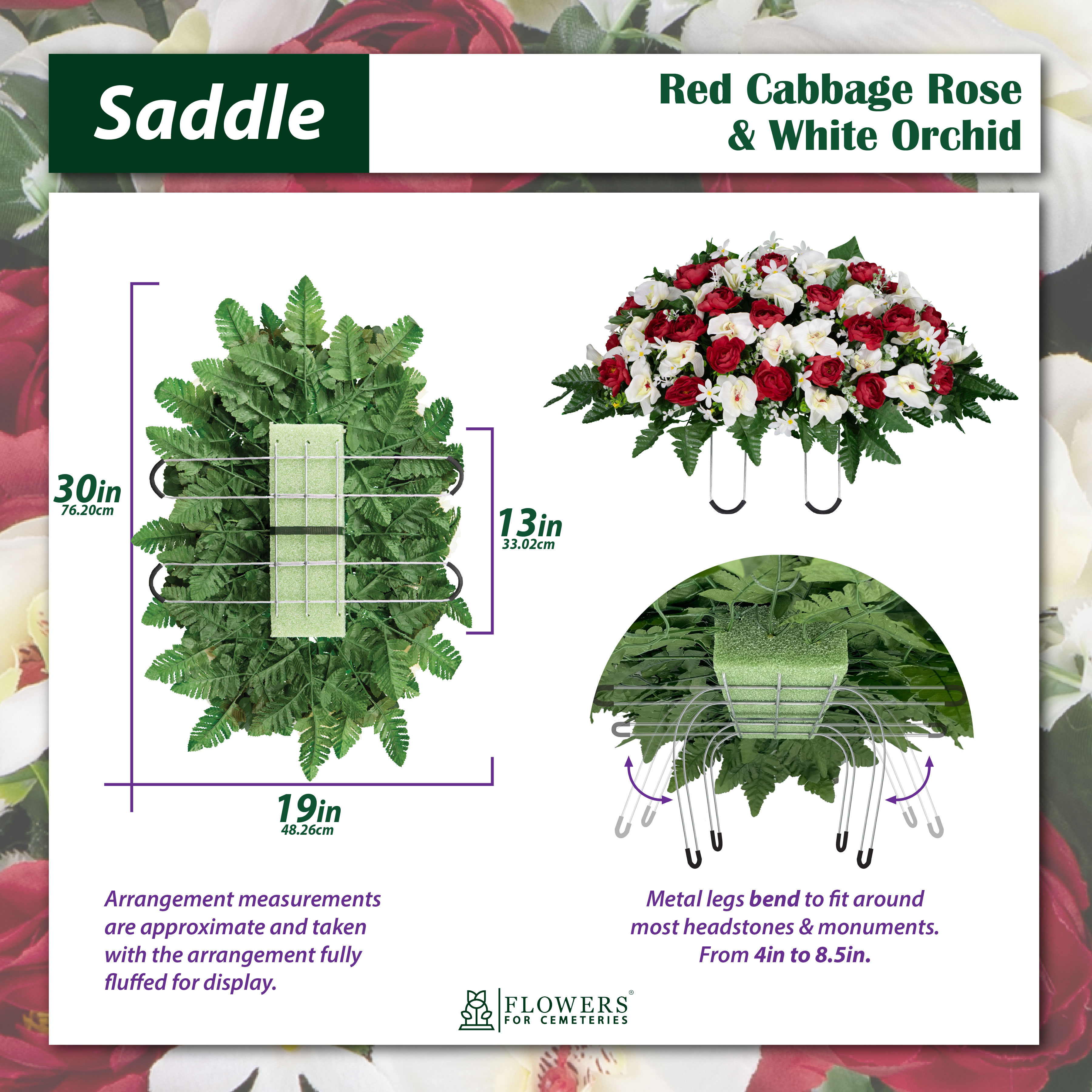 Remember your loved one and adorn their monument with an array of Red Cabbage Roses and White Orchids. This cheerful monument saddle will bring a feeling of happiness and joy to the resting place of your loved one. Greenery is placed throughout the floral arrangement and fern surrounds the bottom of the arrangement.