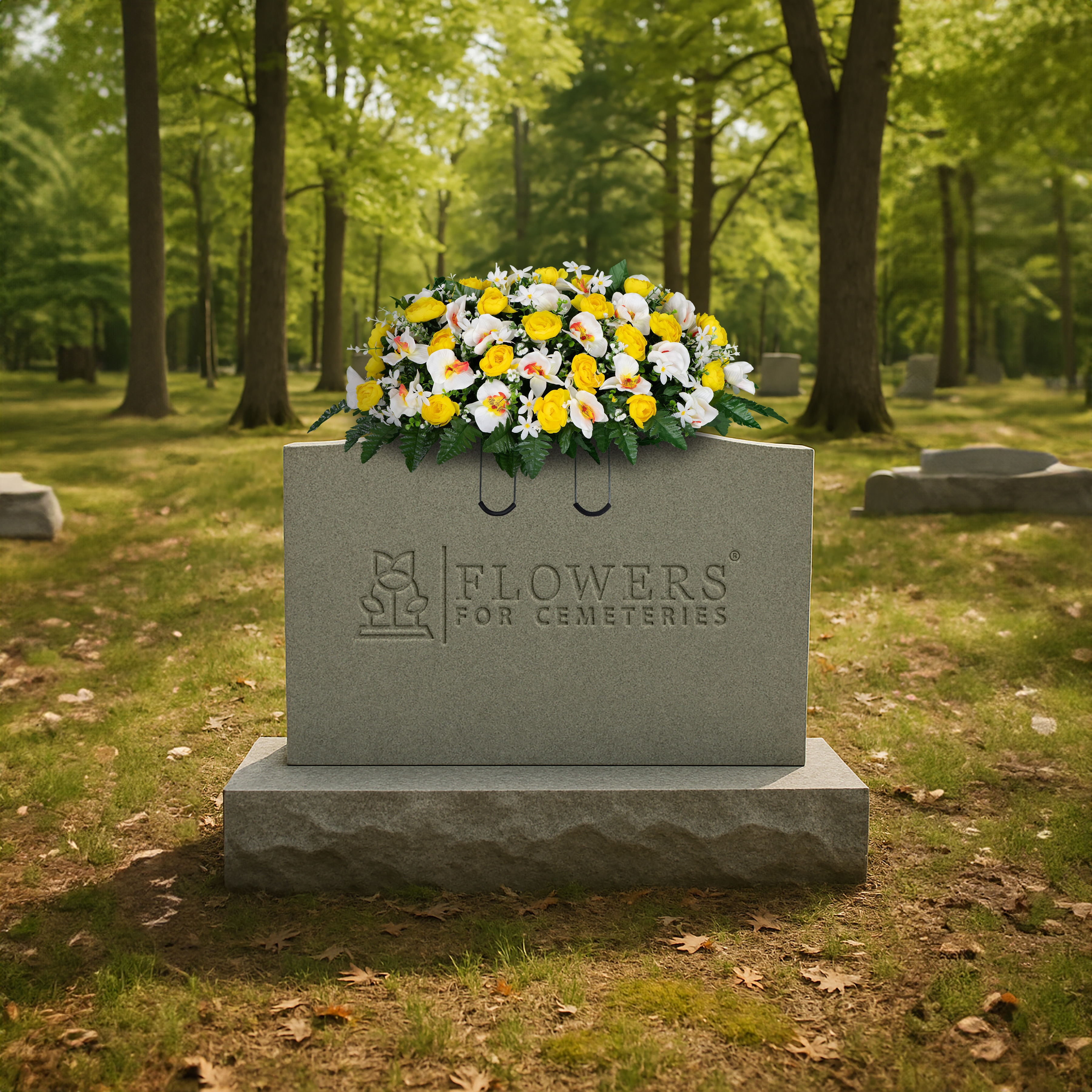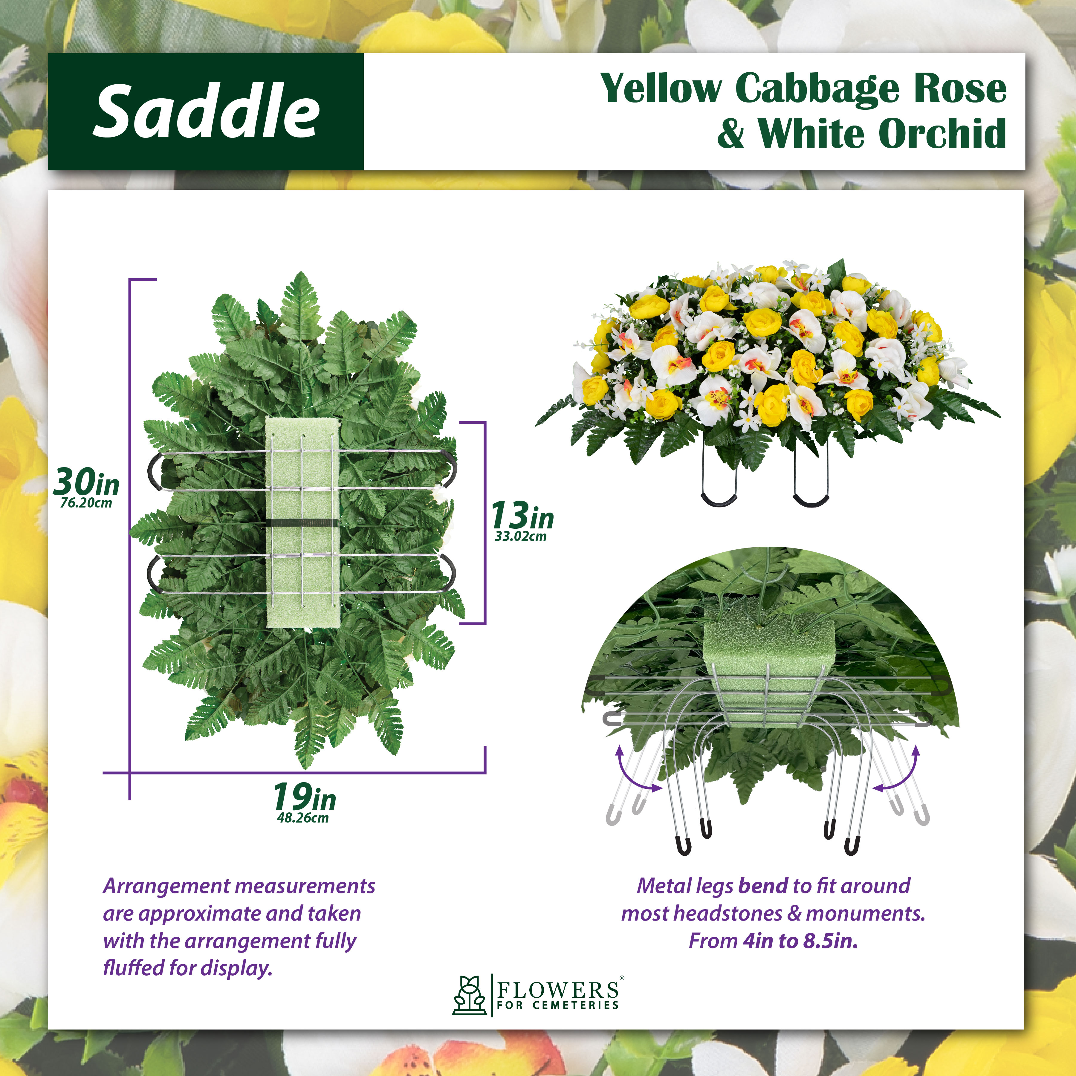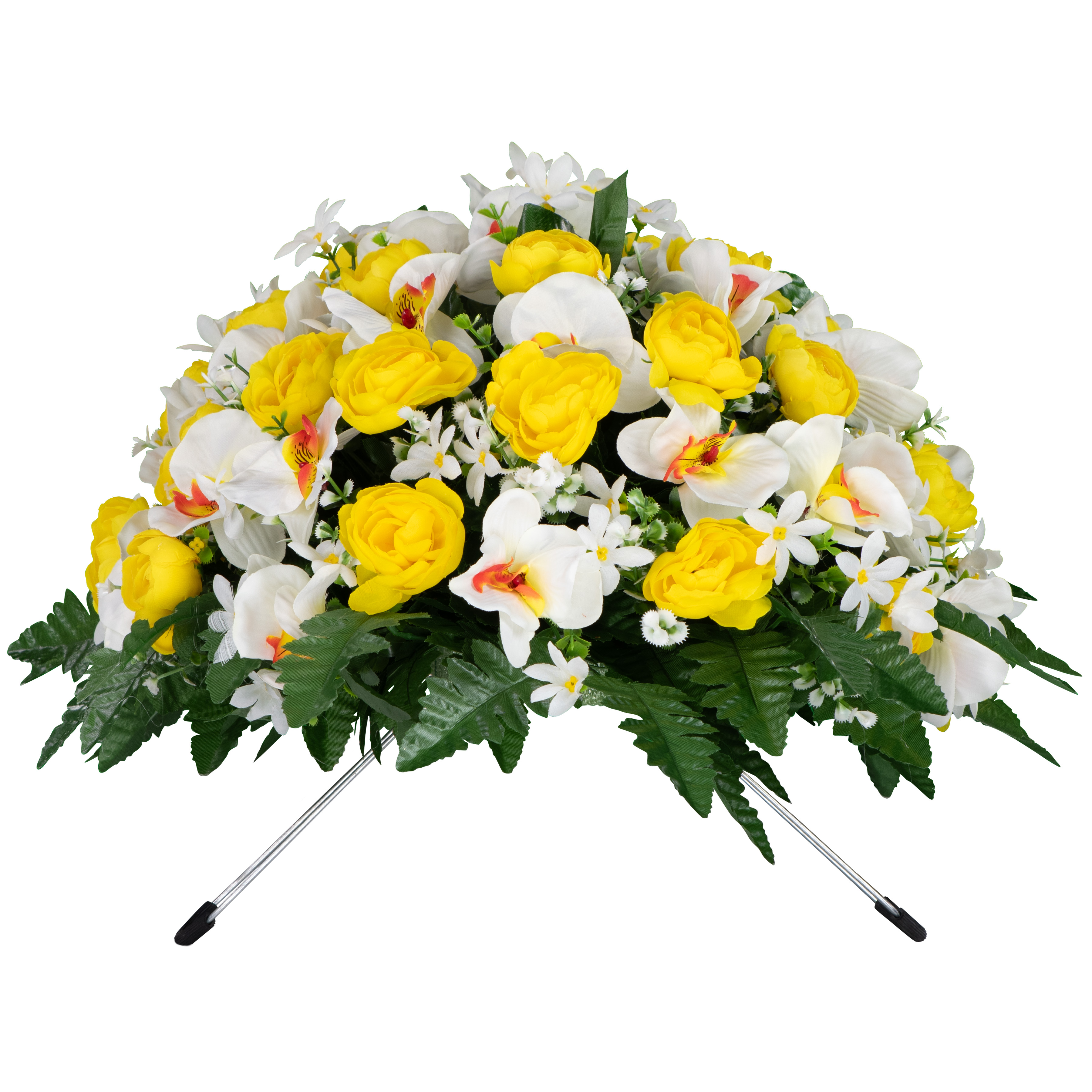 Remember your loved one and adorn their monument with an array of Yellow Cabbage Roses and White Orchids. This cheerful monument saddle will bring a feeling of happiness and joy to the resting place of your loved one. Greenery is placed throughout the floral arrangement and fern surrounds the bottom of the arrangement.