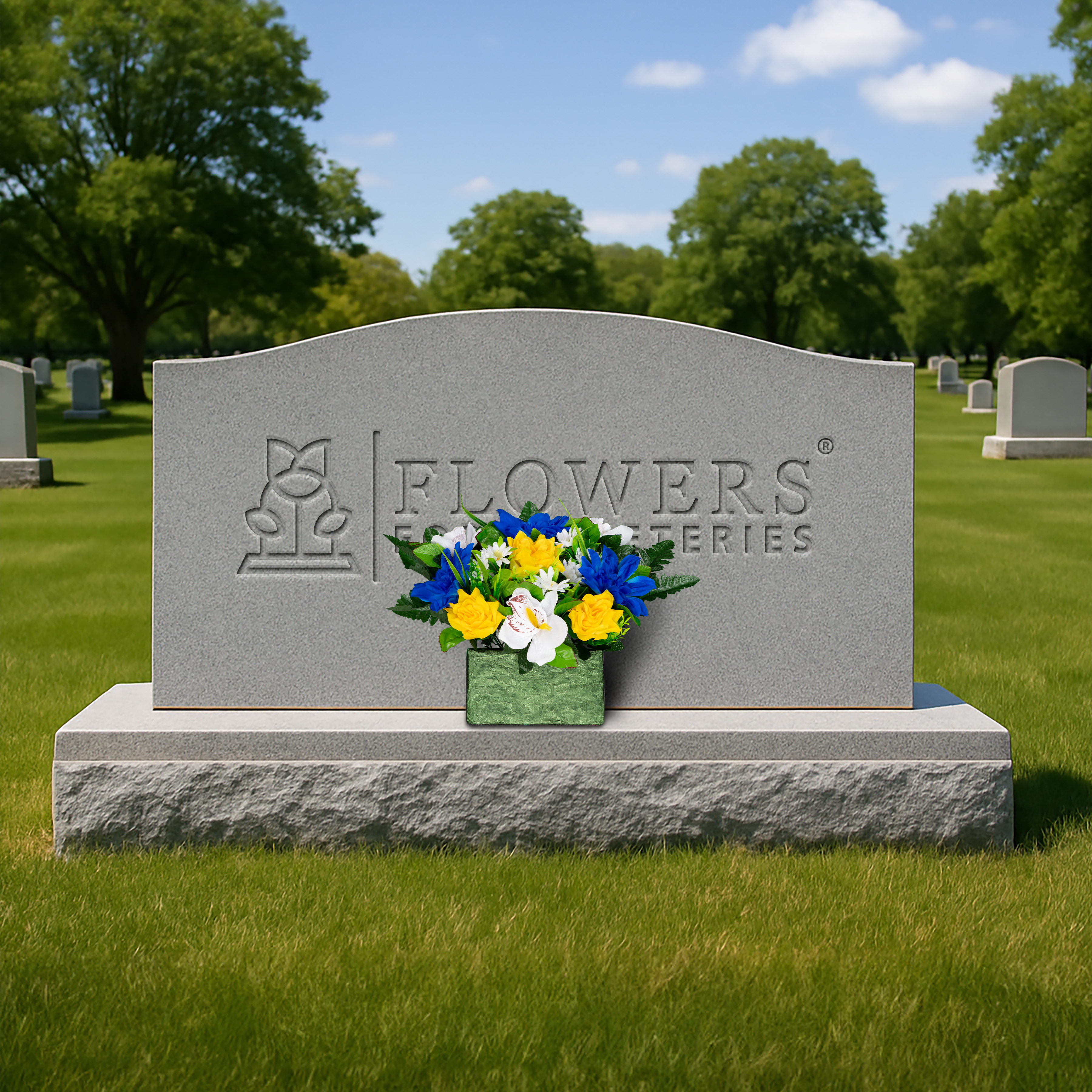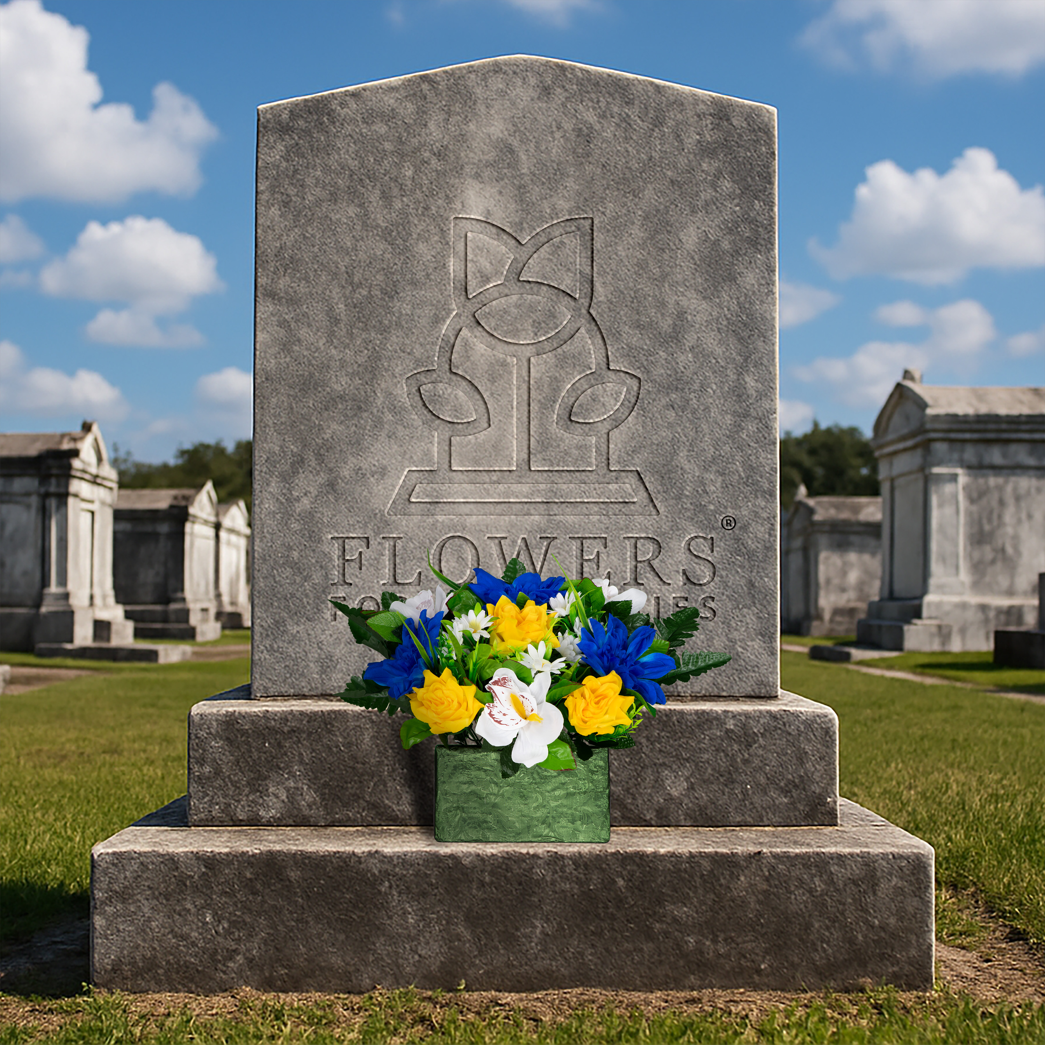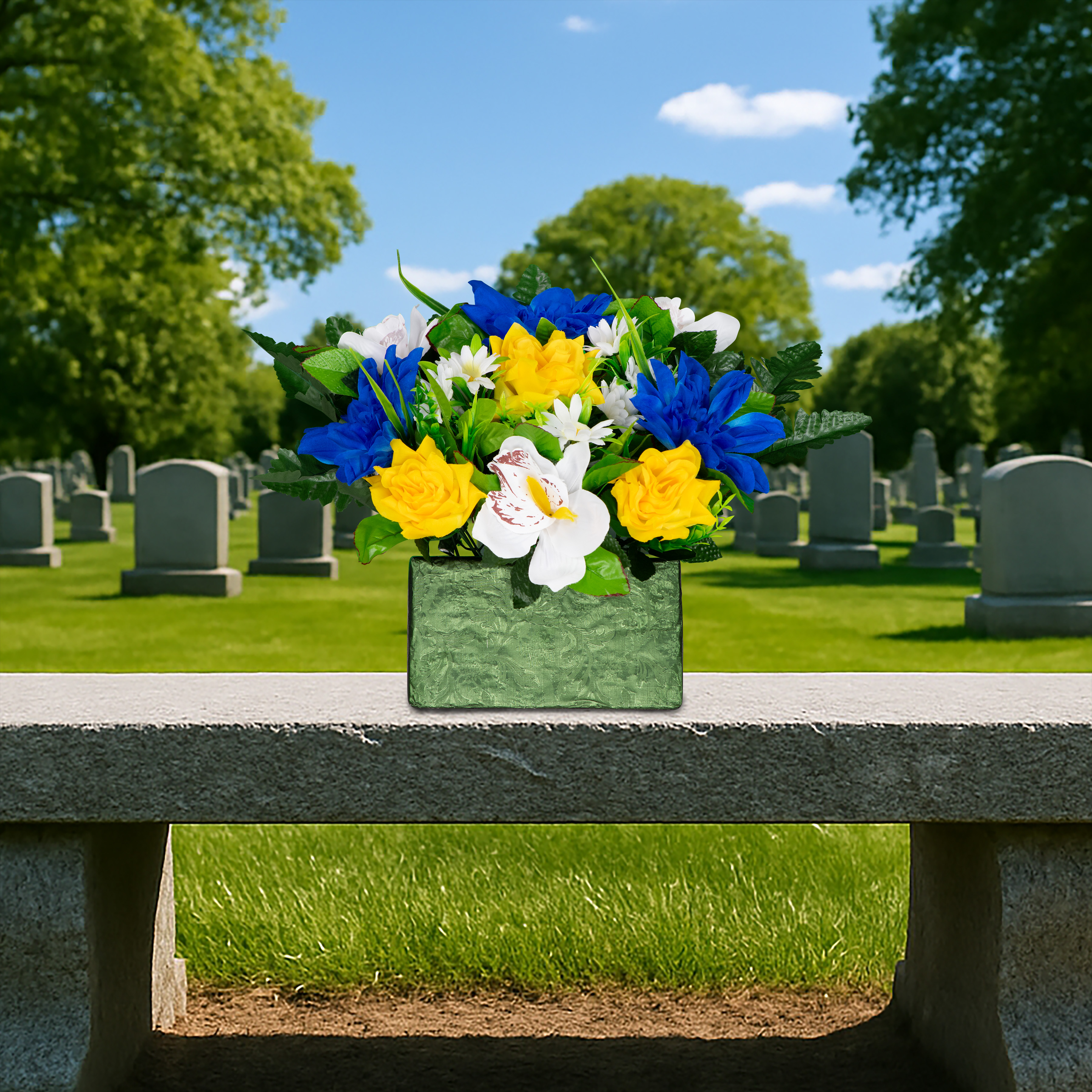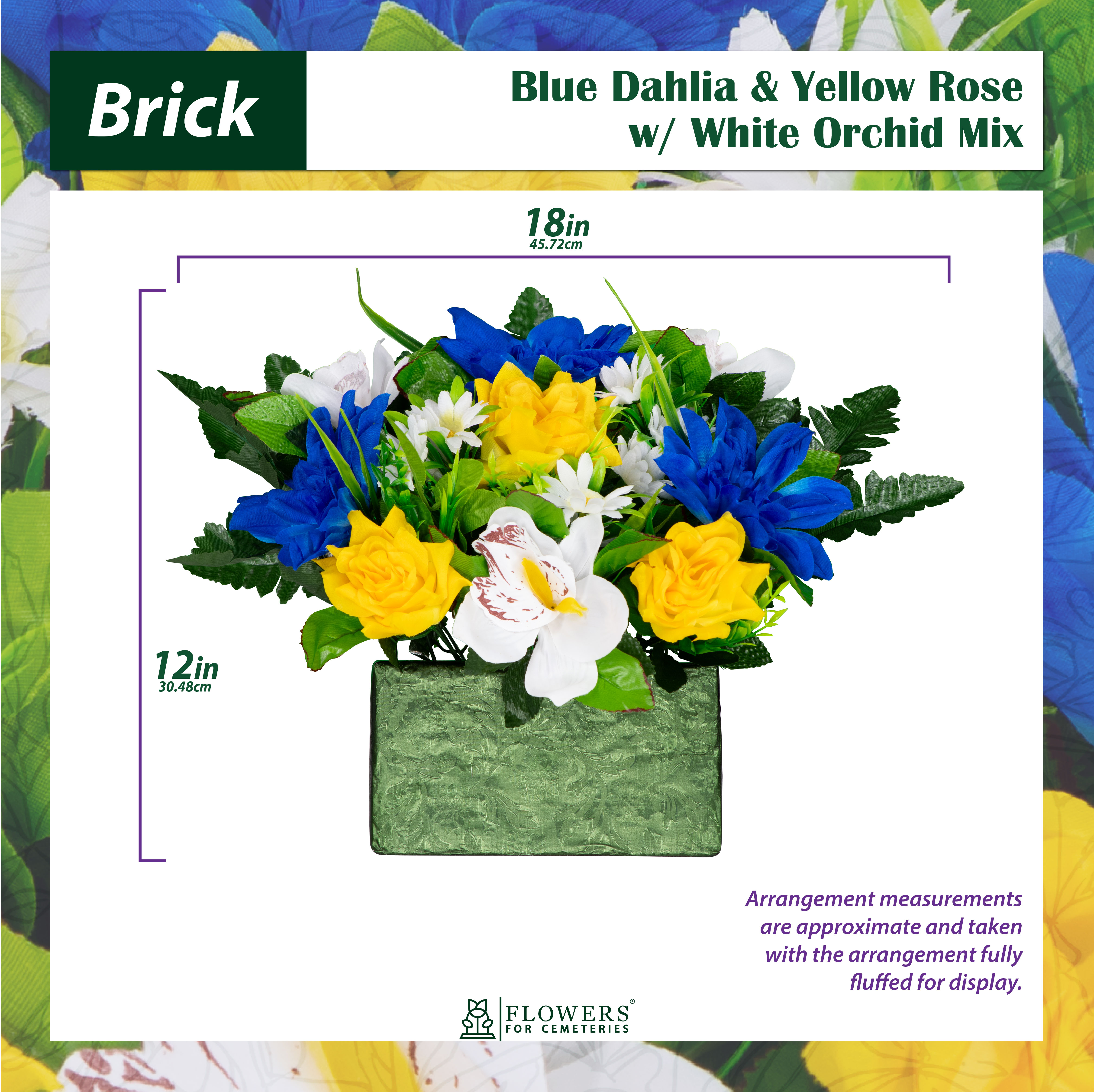 Remember your loved one with this beautiful arrangement made on a concrete brick using Blue Dahlia and Yellow Rose with White Orchid. Monument Brick arrangements are used to memorialize a loved one’s grave when no vase is available to place flowers in and sits directly on the ground or on a monument. The arrangement is designed to be one sided and placed against a headstone. A brick is used to give the arrangement a low center of gravity to reduce the chance that it will get blown over by the wind. The brick is covered with a decorative green foil paper for a smooth appearance.