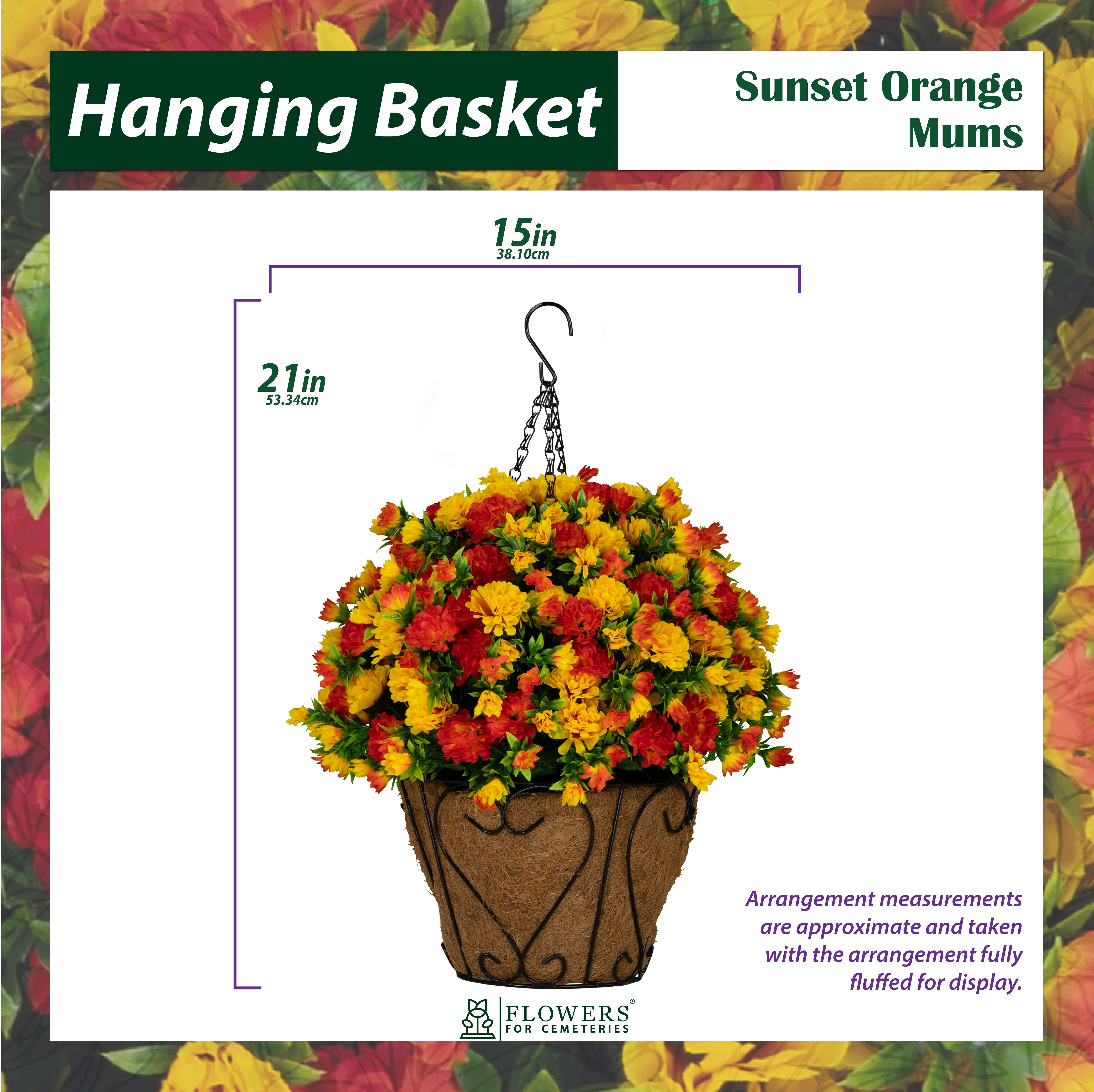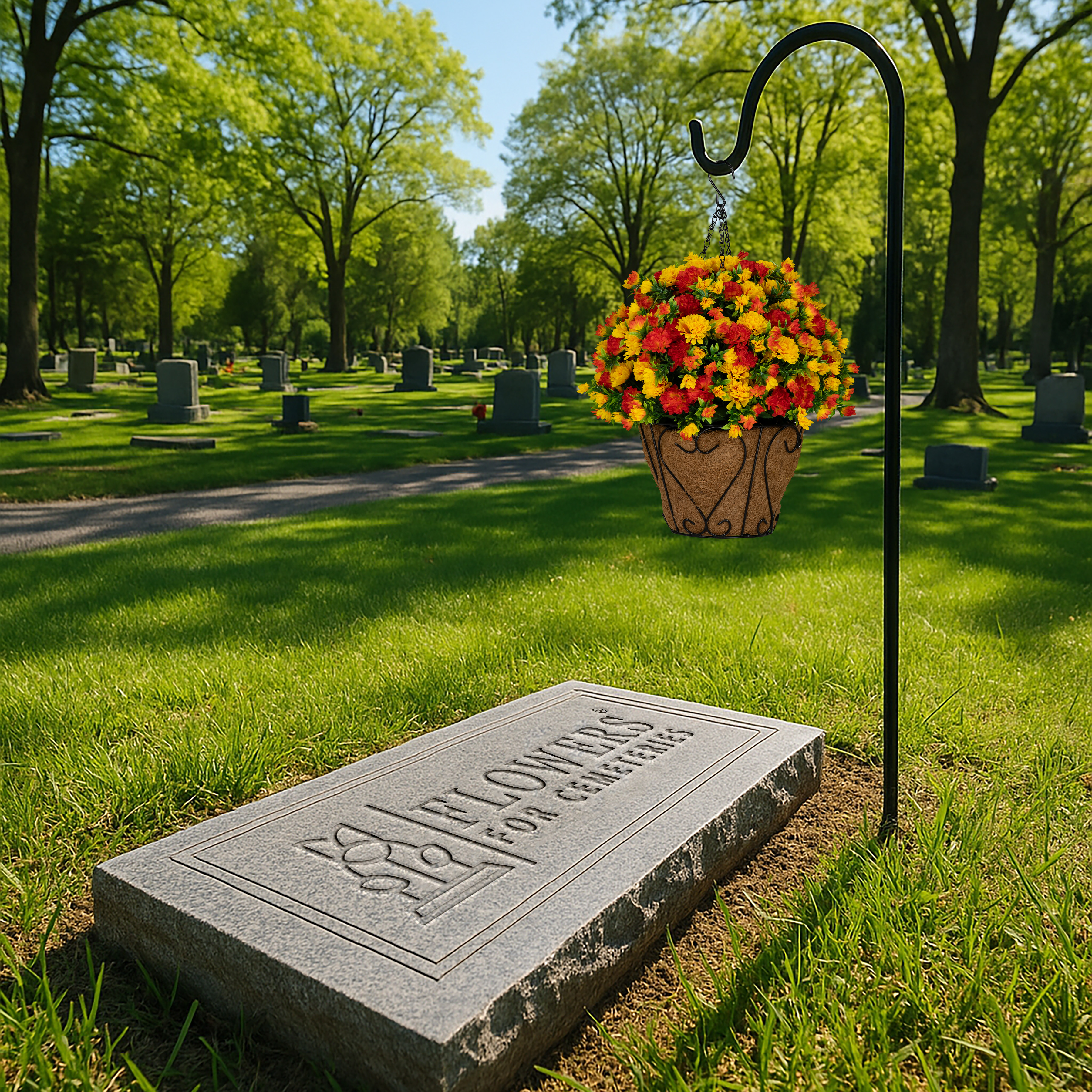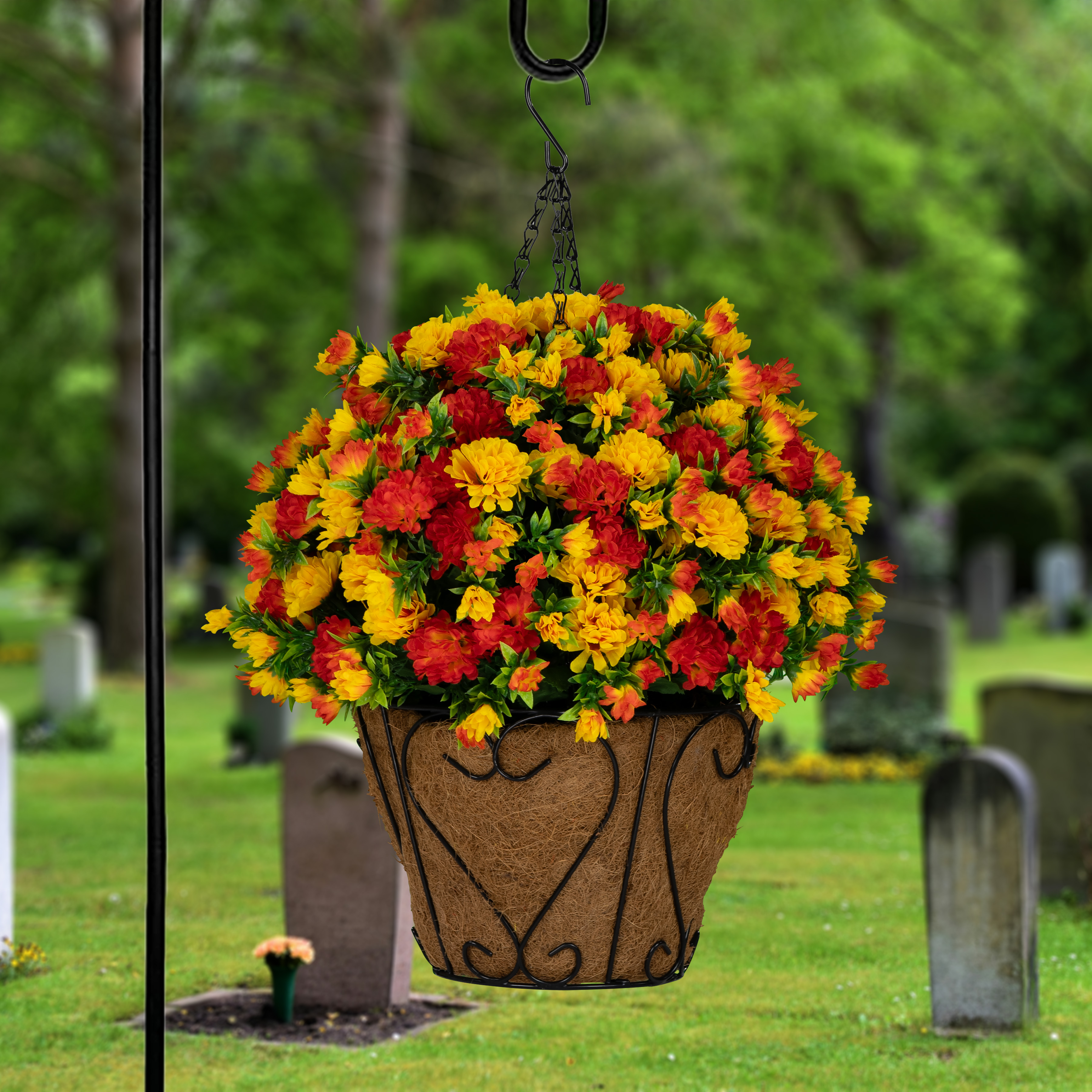 This hanging basket is perfect for a shepherd’s hook at a gravesite, porch railings, patio hooks, and more. (Shepherd’s hook not included.)