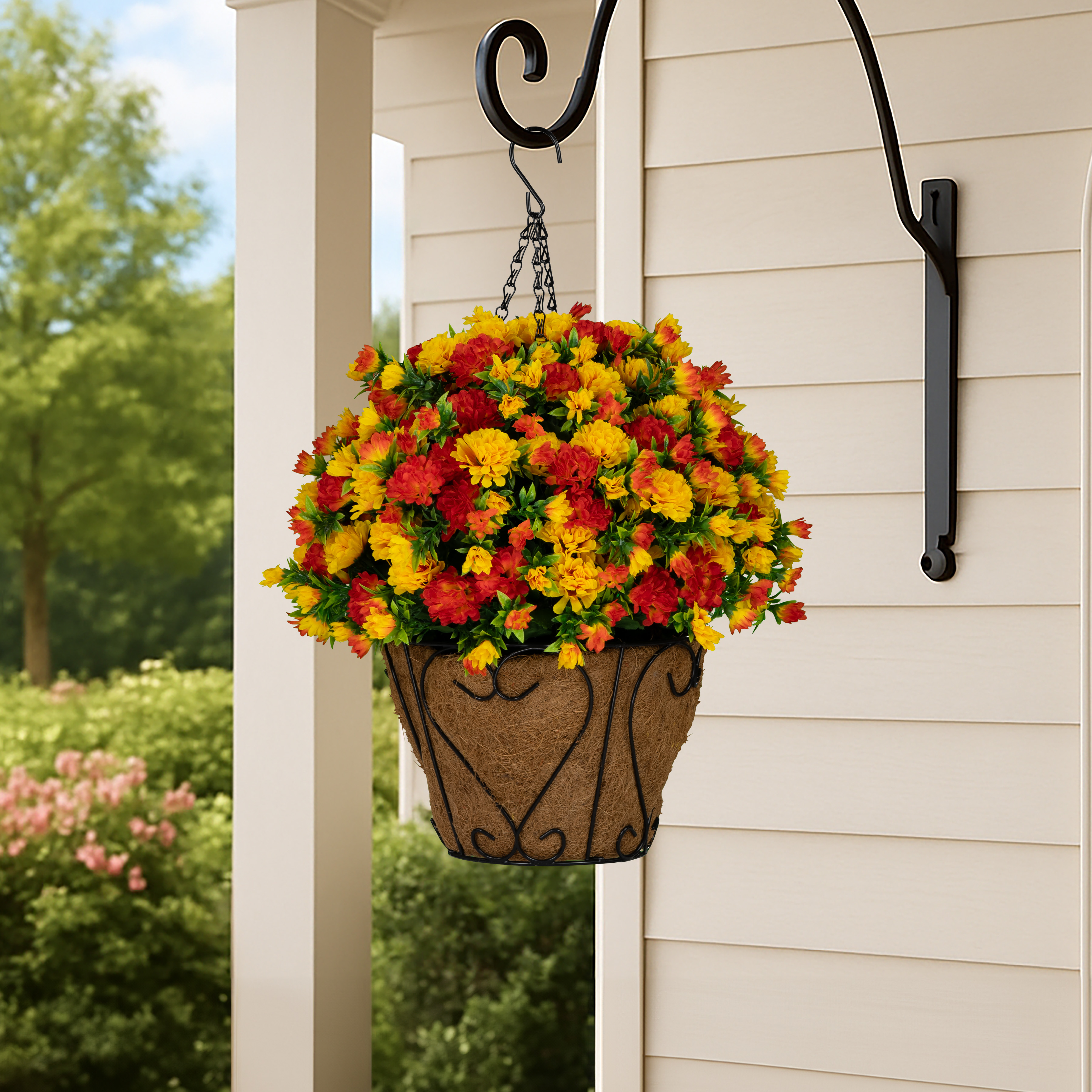 Grace any space with our beautiful hanging basket, thoughtfully designed for beauty, durability, and versatility. Whether serving as a charming addition to your front porch, or an eye-catching accent for your garden, this basket is built to endure the elements while showcasing a beautiful flower arrangement.