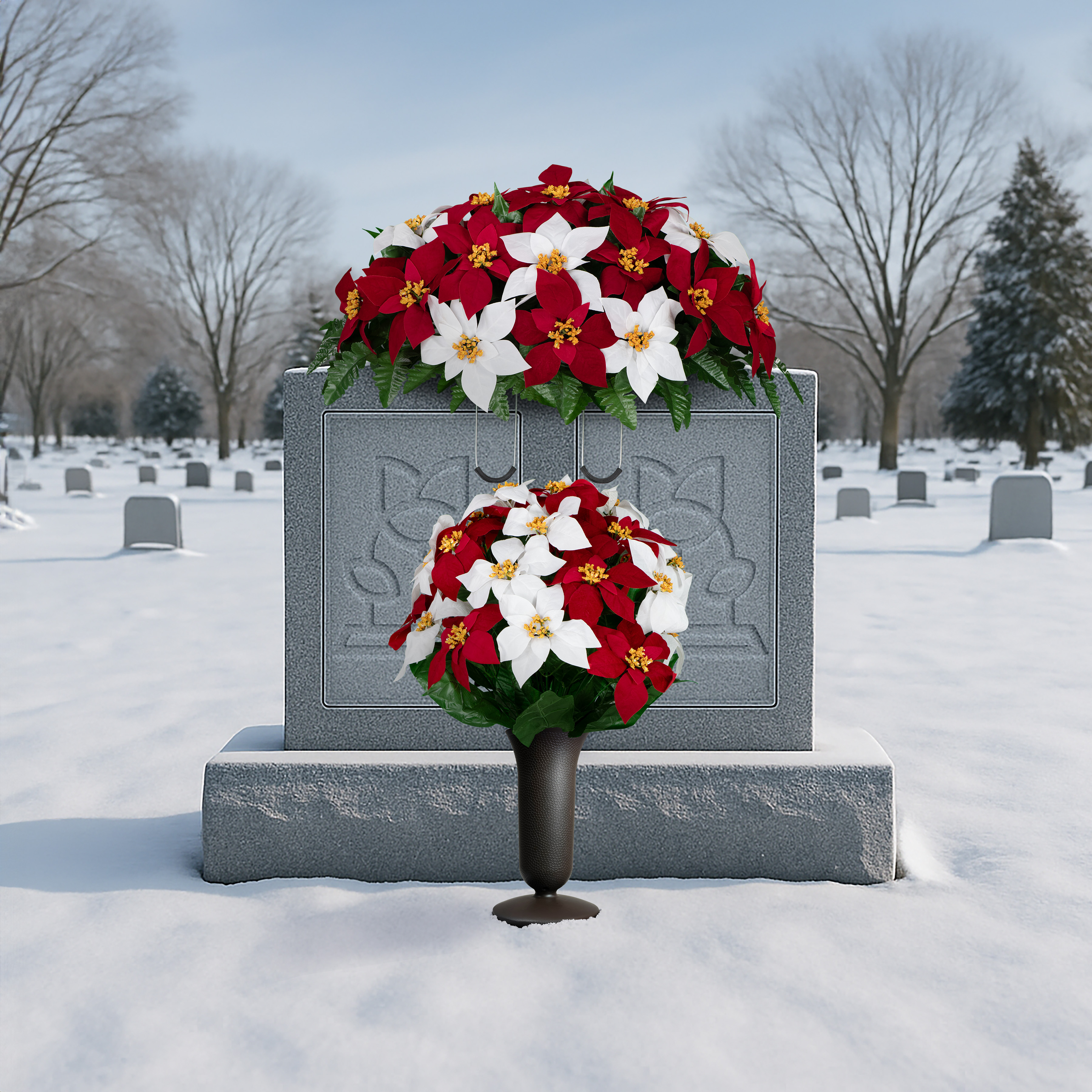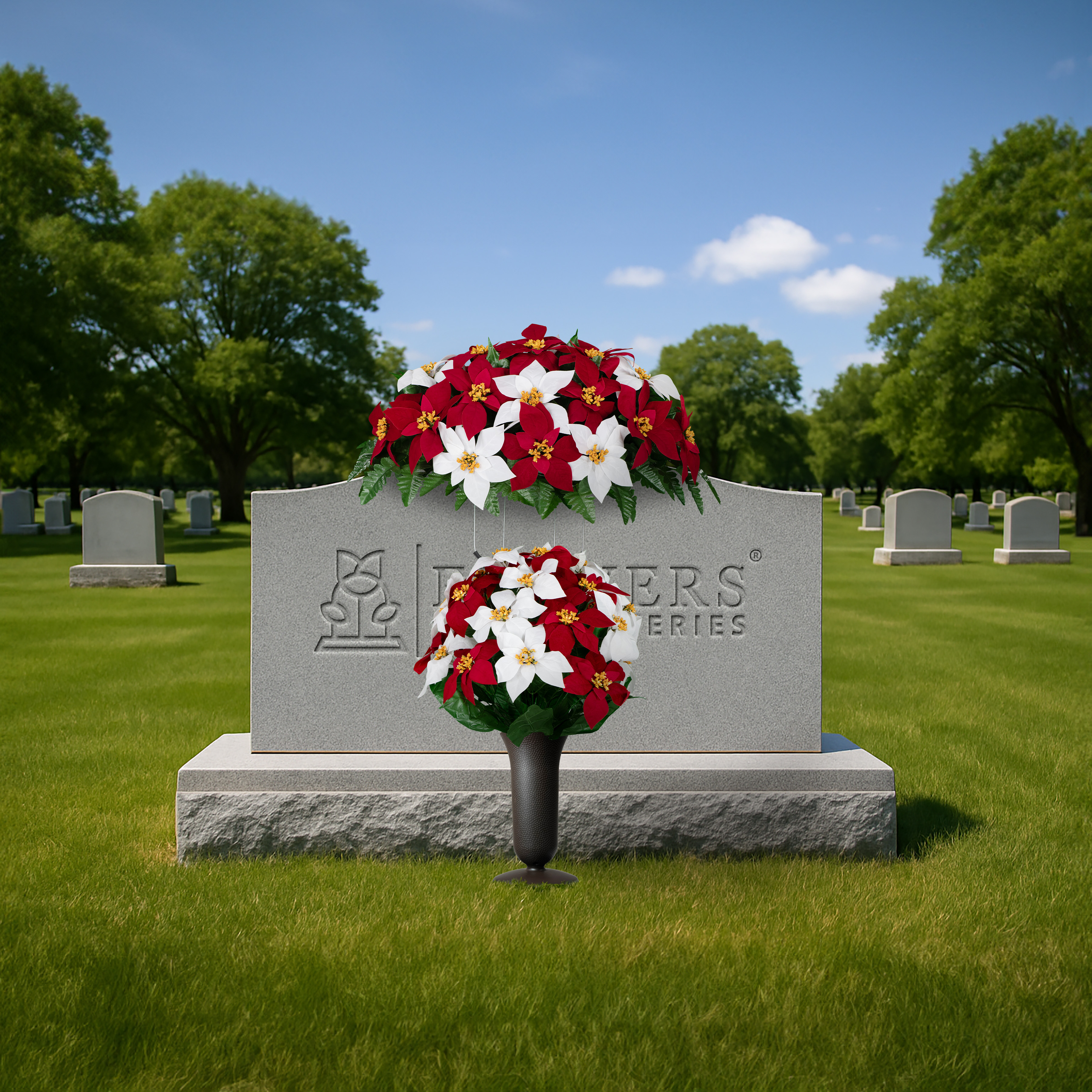 Honor your loved one with this beautiful silk flower arrangement bundle, featuring vibrant Red and White Poinsettias accented by lush greenery. This complete memorial set includes one monument saddle, one matching bouquet, and one Sympathy Silks® vase, creating a coordinated, elegant tribute that will stay beautiful for months outdoors.