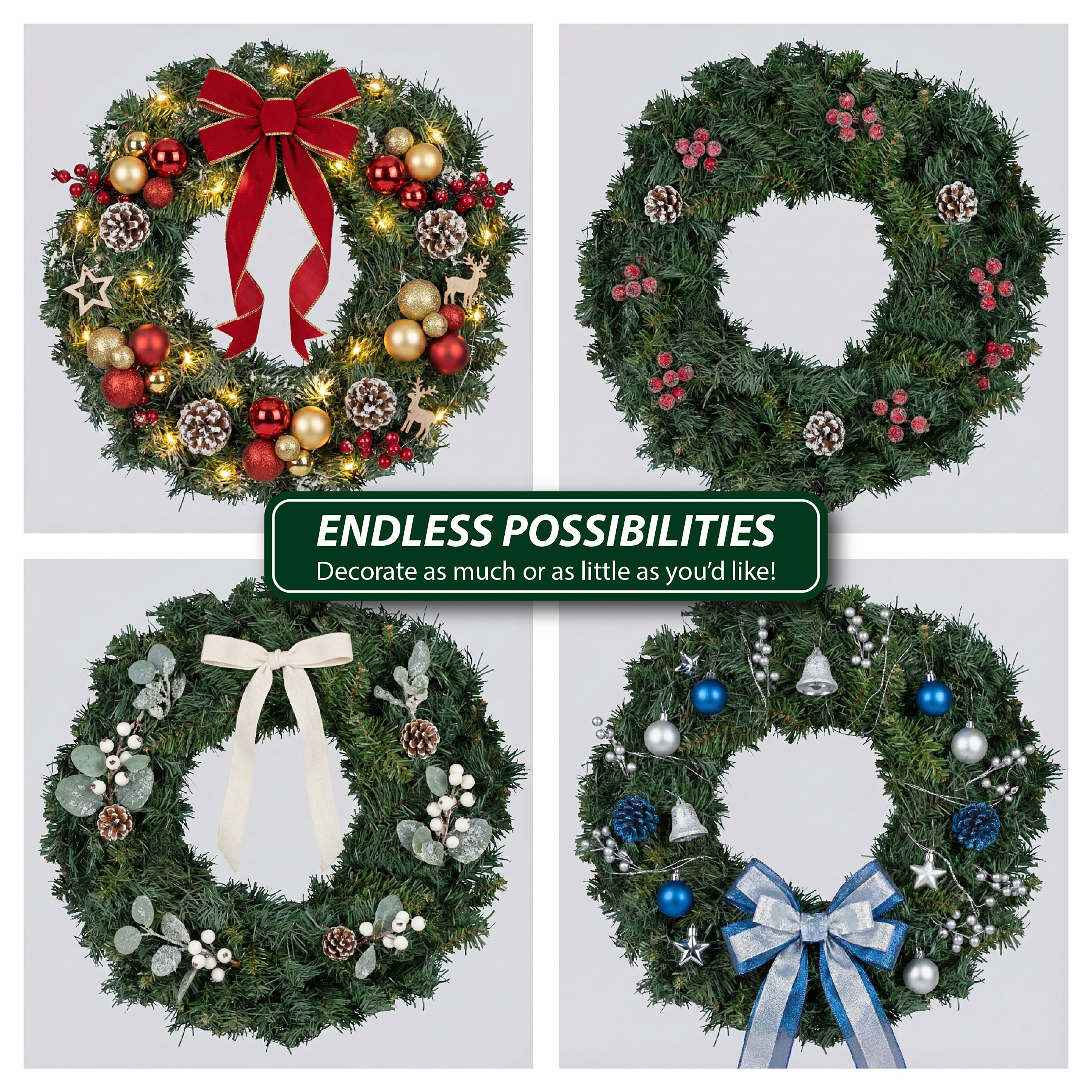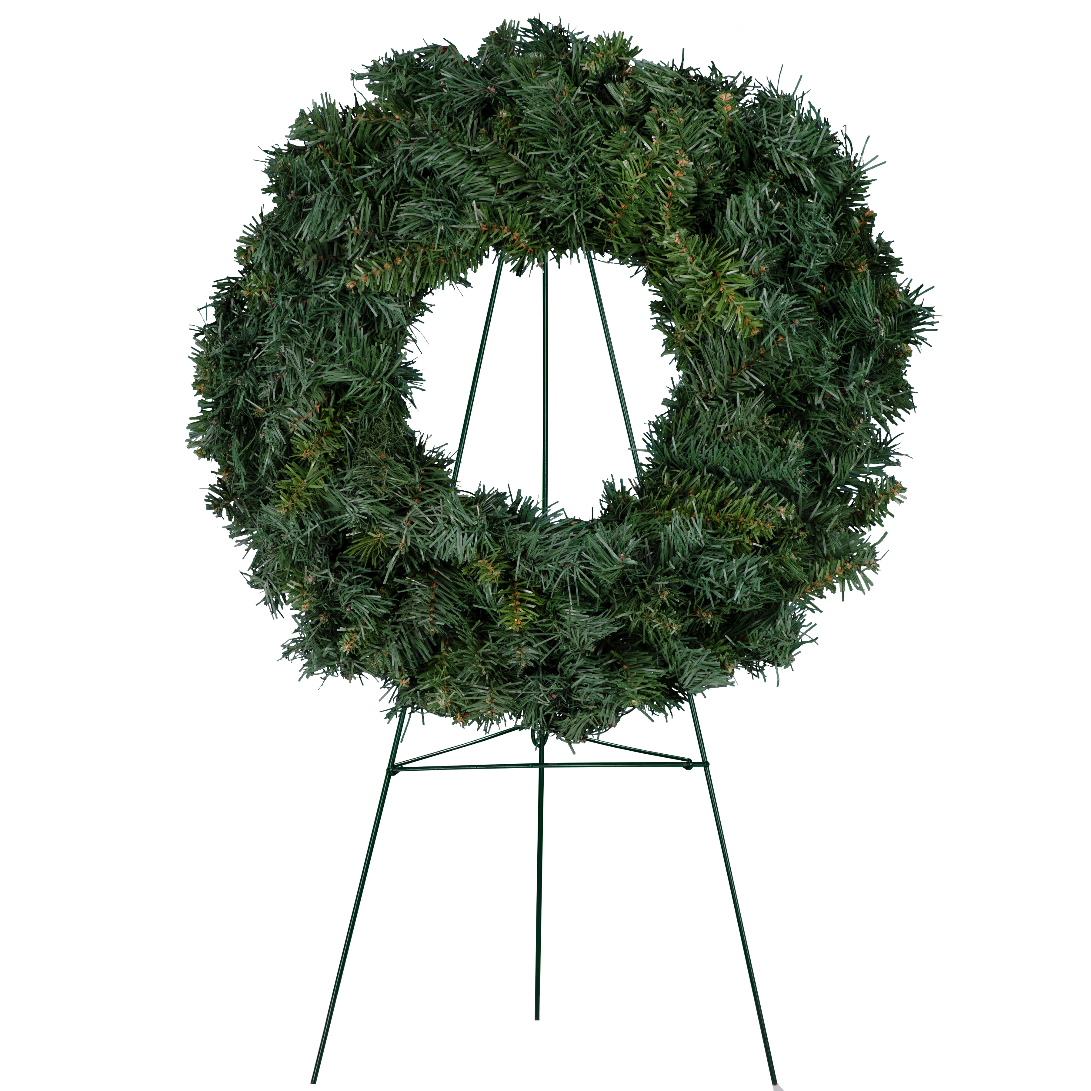 Celebrate the season with this full, lush 24-inch artificial pine wreath, designed as a blank canvas for your own creative touch. Its natural evergreen texture offers the perfect foundation for DIY decorating, whether you or your loved one prefer classic holiday trims, modern minimal styles, or personalized memorial accents. Each wreath is crafted to arrive ready to display with an attached metal easel (28-inch tall).